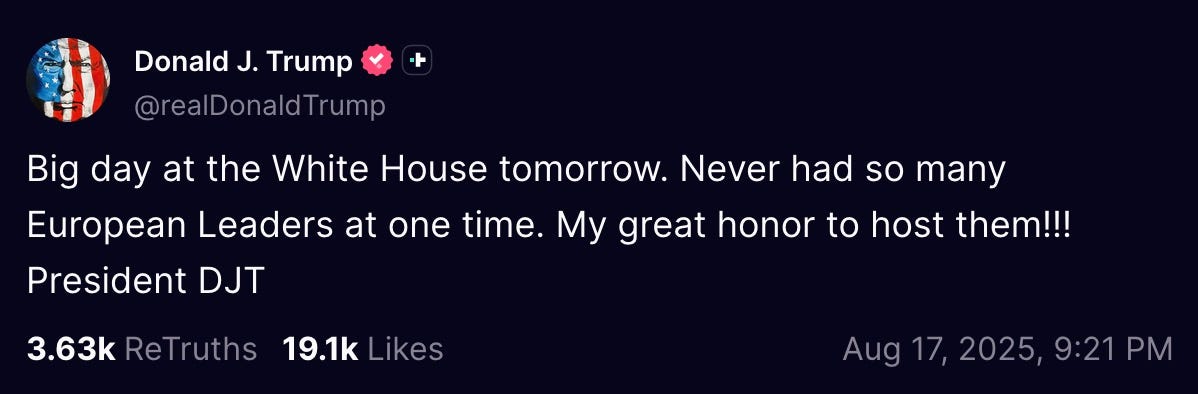 “Big day at the White House tomorrow. Never had so many European Leaders at one time. My great honor to host them!!! President DJT”