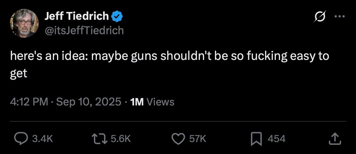 Jesus Fucking Christ, seriously? with all the bullshit going on right now, some idiot — and, as I’m writing this, we don’t know who it was, or their ideology — shot and killed Charlie Kirk.