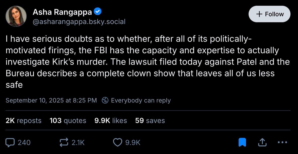 “I have serious doubts as to whether, after all of its politically-motivated firings, the FBI has the capacity and expertise to actually investigate Kirk’s murder. The lawsuit filed today against Patel and the Bureau describes a complete clown show that leaves all of us less safe.”