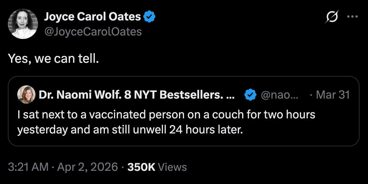 what the fuck happened to Naomi Wolf? she used be a garden-variety ‘wellness’ crank who dabbled in vaccine denial — but then she become a full-bore a full-bore conspiracy loon.