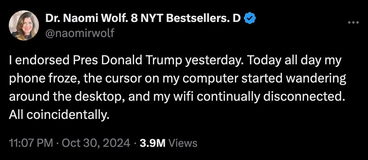 “I endorsed Pres Donald Trump yesterday. Today all day my phone froze, the cursor on my computer started wandering around the desktop, and my wifi continually disconnected. All coincidentally.”