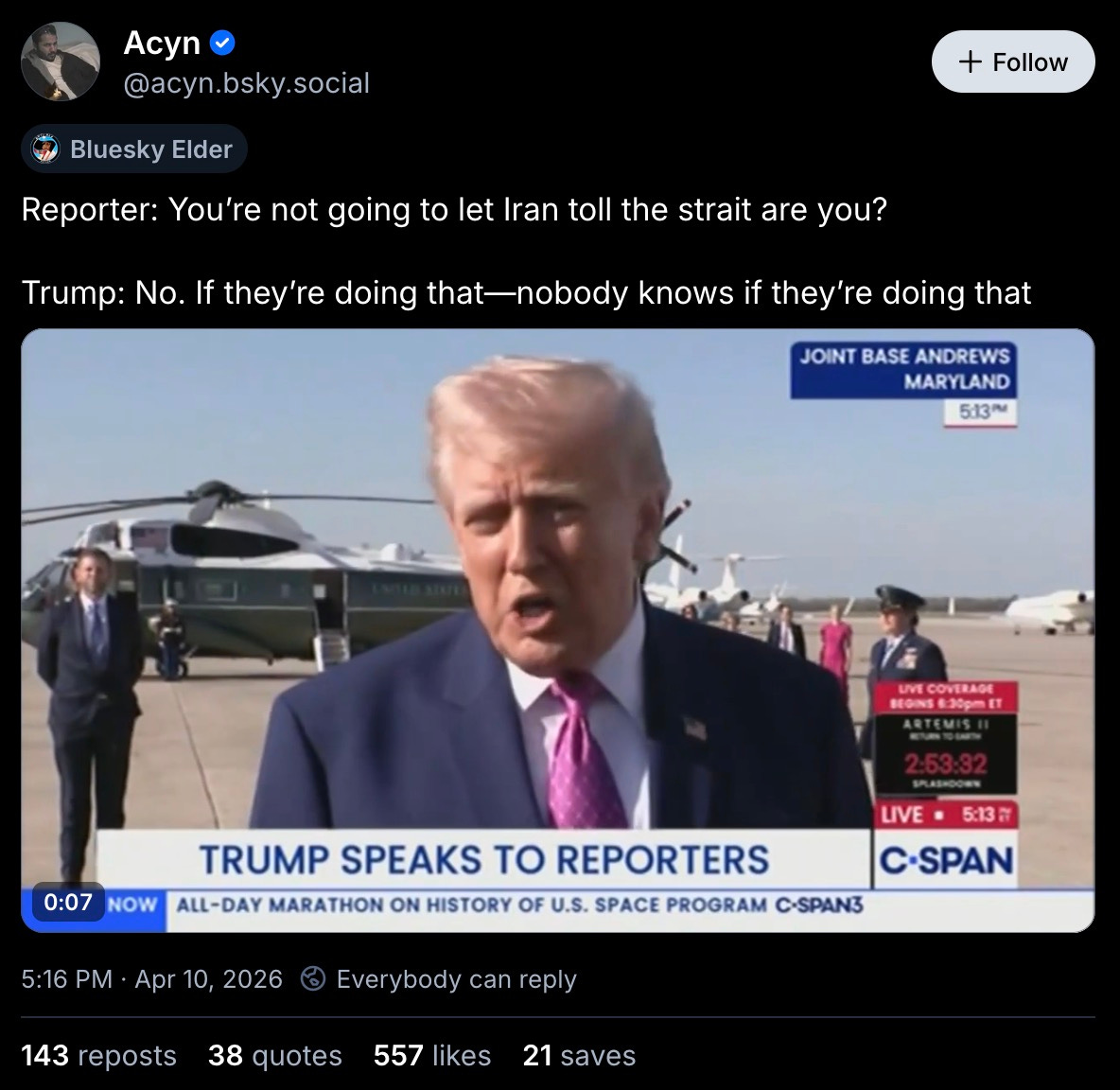 oh, and the one time on Friday that the press got managed to get close enough to the fucking idiot to ask him questions — as he was headed to his Florida golf motel — he proved to be as befuddled, out-of-touch and ill-informed as ever.