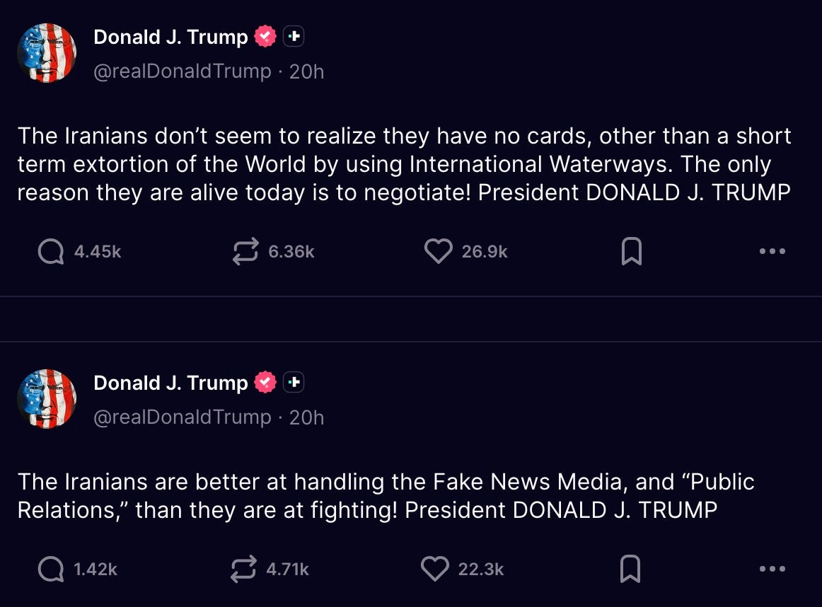 Iran holds no cards? I’m pretty sure that any country who can shut down a major shipping route at will — and trick the fucking idiot into agreeing to it — holds a shitload of cards.