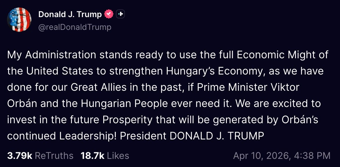 oh look, the fucking idiot is promising to use the ‘full economic might of the United States’ to prop up the failing economy of his depot bestie Orbán’s Hungary.