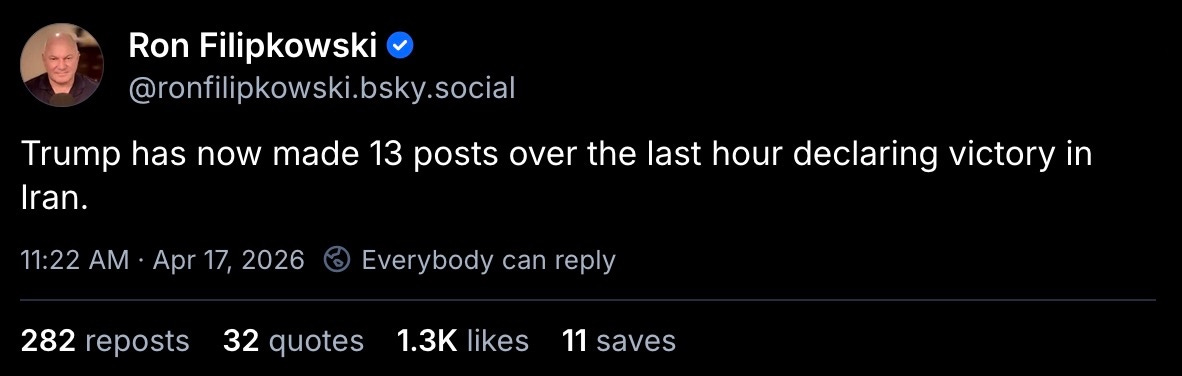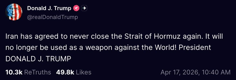 (hi. Jeff of the Future here, breaking into the narrative on Saturday morning to let you know that that a mere 20 hours after the fucking idiot made that boast, the Strait of Hormuz is already closed down again.)