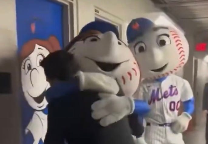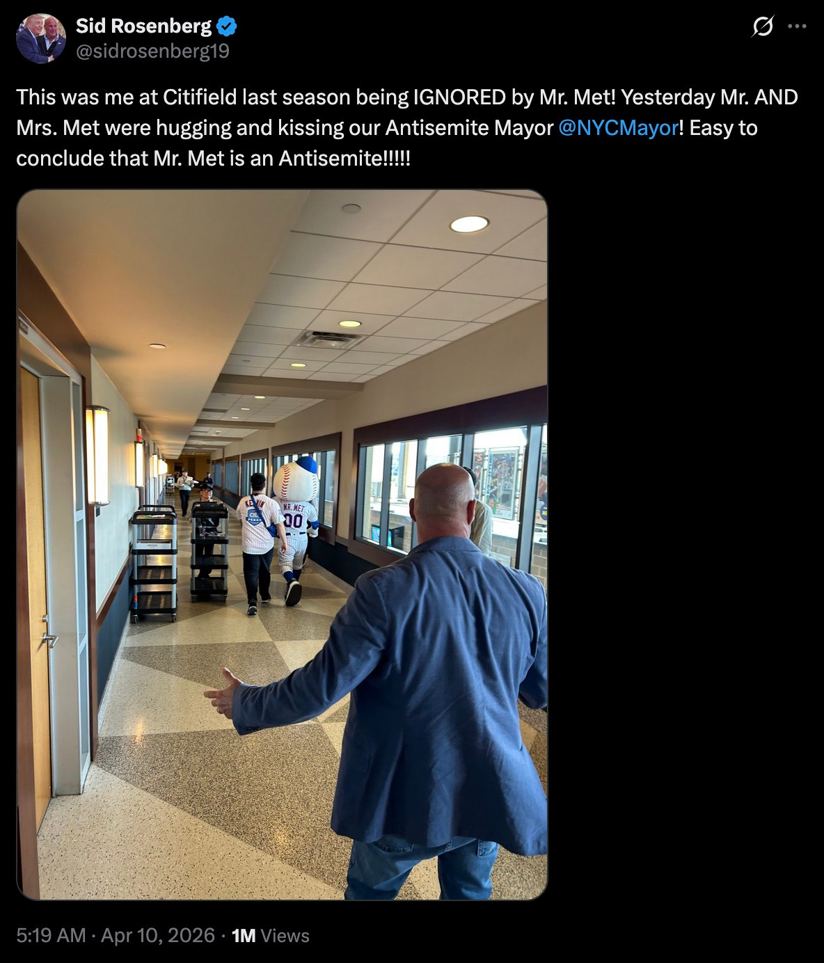 “This was me at Citifield last season being IGNORED by Mr. Met! Yesterday Mr. AND Mrs. Met were hugging and kissing our Antisemite Mayor @NYCMayor! Easy to conclude that Mr. Met is an Antisemite!!!!!”