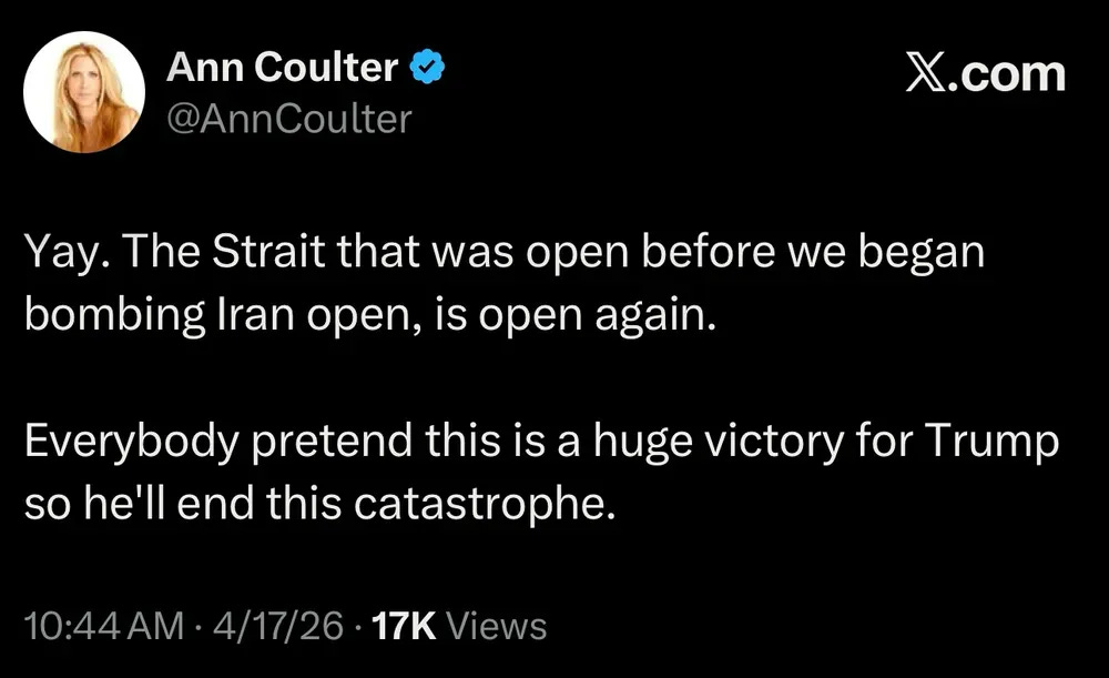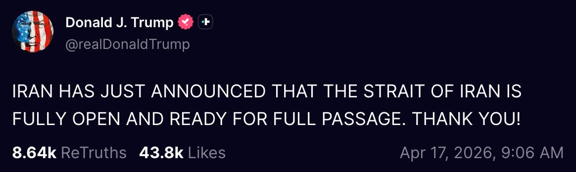 some fucking idiot’s Friday started off with some allegedly good news. the fucking idiot loudly announced the re-opening of the ‘Strait of Iran,’ whatever the fuck that is