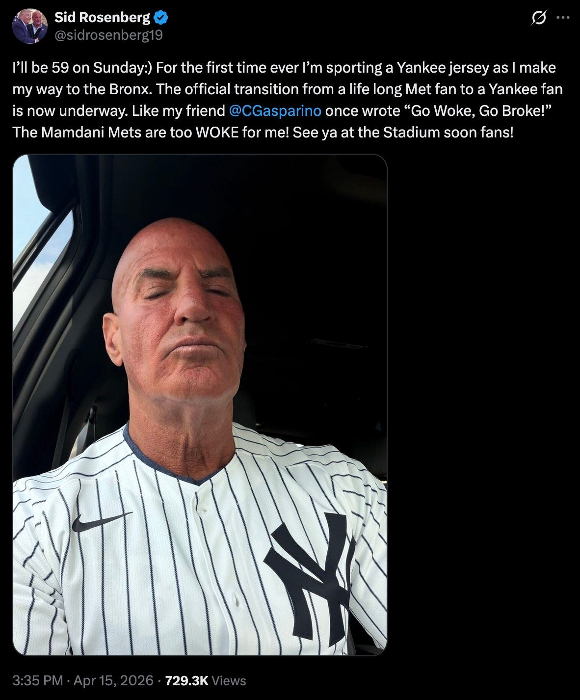 “I’ll be 59 on Sunday:) For the first time ever I’m sporting a Yankee jersey as I make my way to the Bronx. The official transition from a life long Met fan to a Yankee fan is now underway. Like my friend @CGasparino once wrote ‘Go Woke, Go Broke!’ The Mamdani Mets are too WOKE for me! See ya at the Stadium soon fans!”
