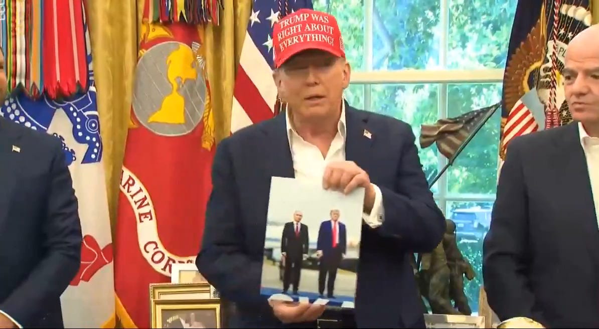 “I’m going to sign this for him. I was sent one. I thought you’d all like to see it. it’s a man named Vladimir Putin, who I believe will be coming, depending on what happens. he may be coming and he may not. depending on what happens. we have a lot of things happening over the next couple of weeks. but I thought it was a nice picture. of him. okay of me, but nice of him. so that was very nice that it was sent.”
