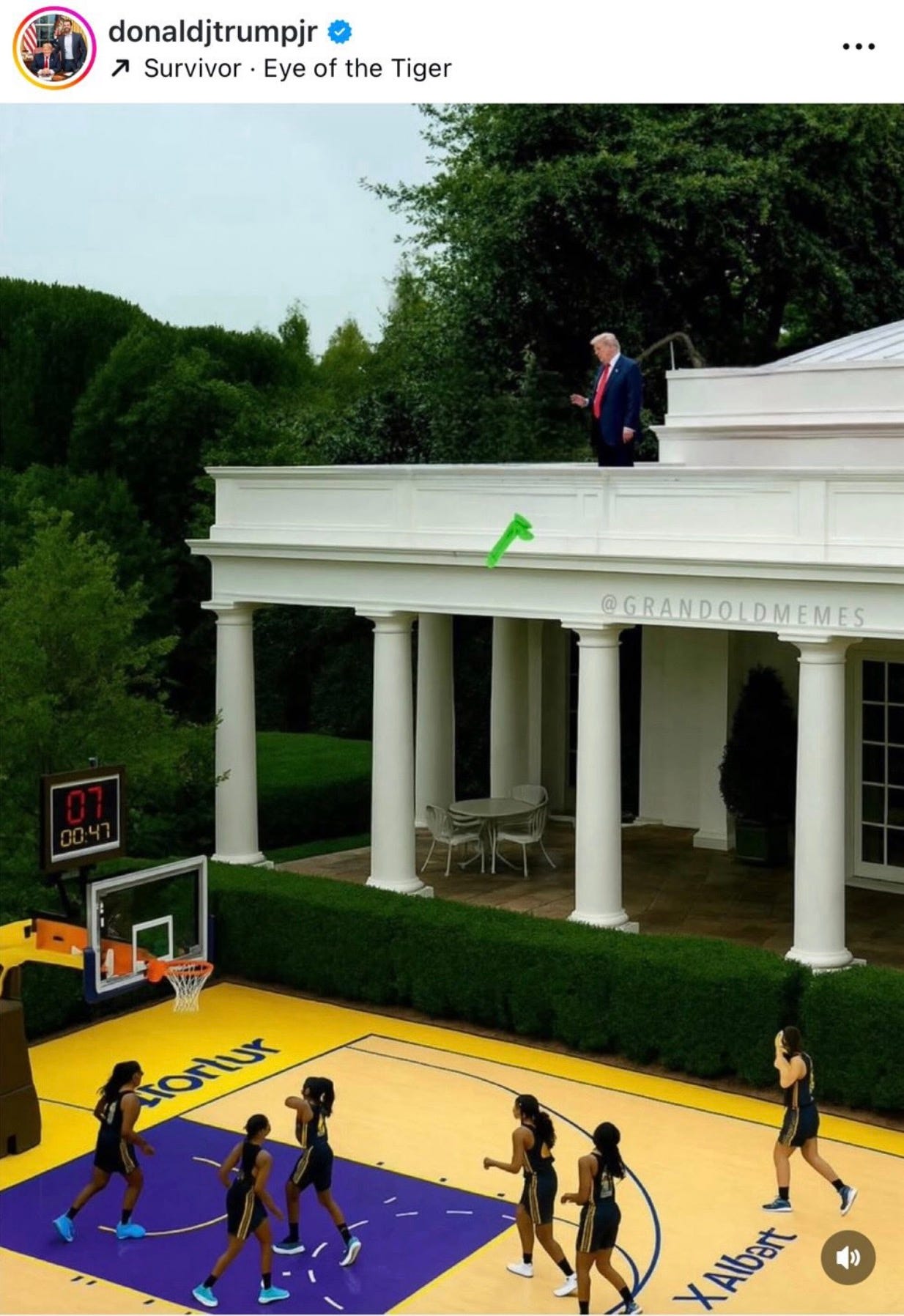 oh look, Cokey’s abusive father is throwing a green dildo from the roof of the White House down onto where a women’s basketball game is taking place. I guess it’s on the that parking-lot abomination where the Rose Garden used to be?