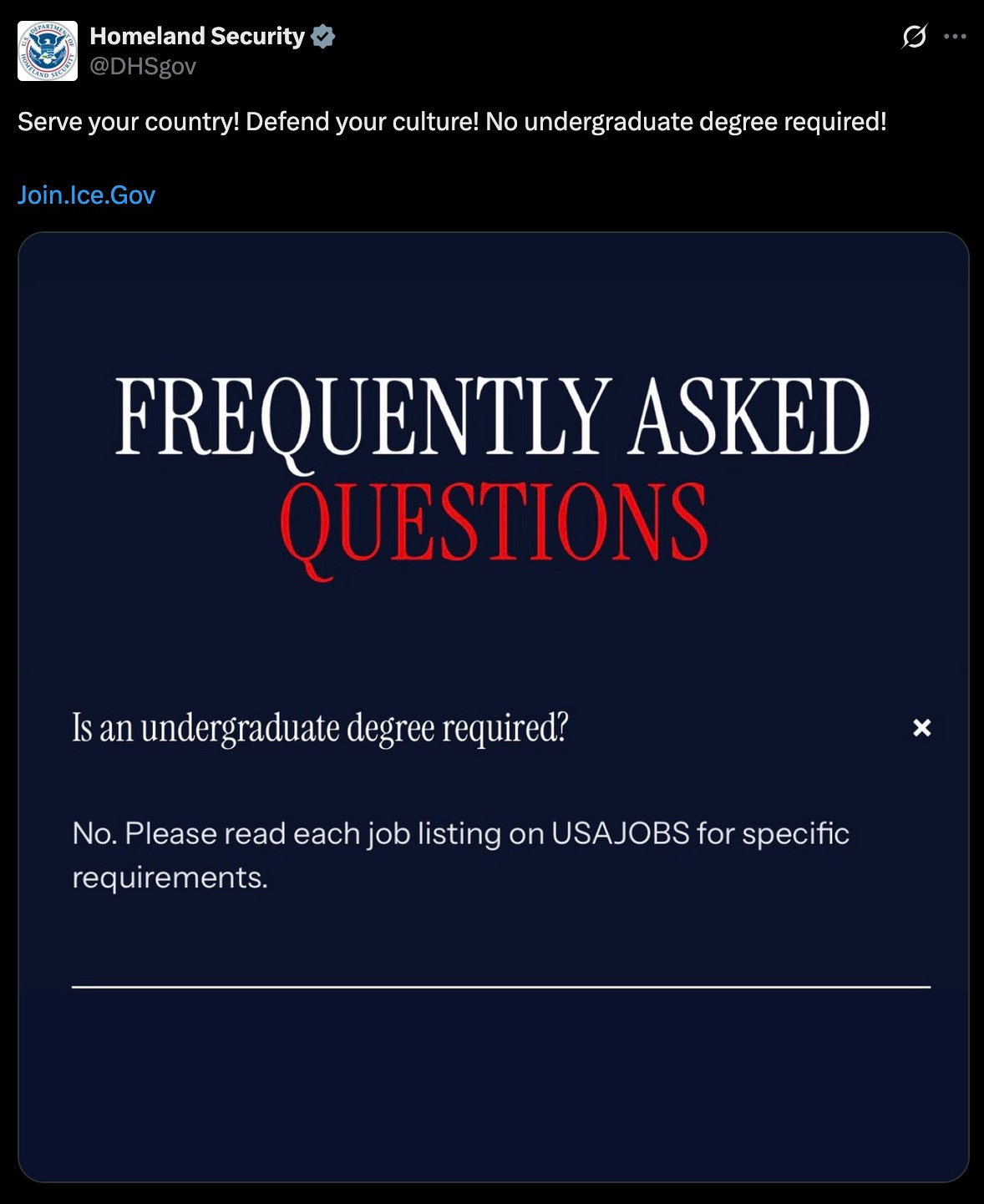 “Serve your country! Defend your culture! No undergraduate degree required!”