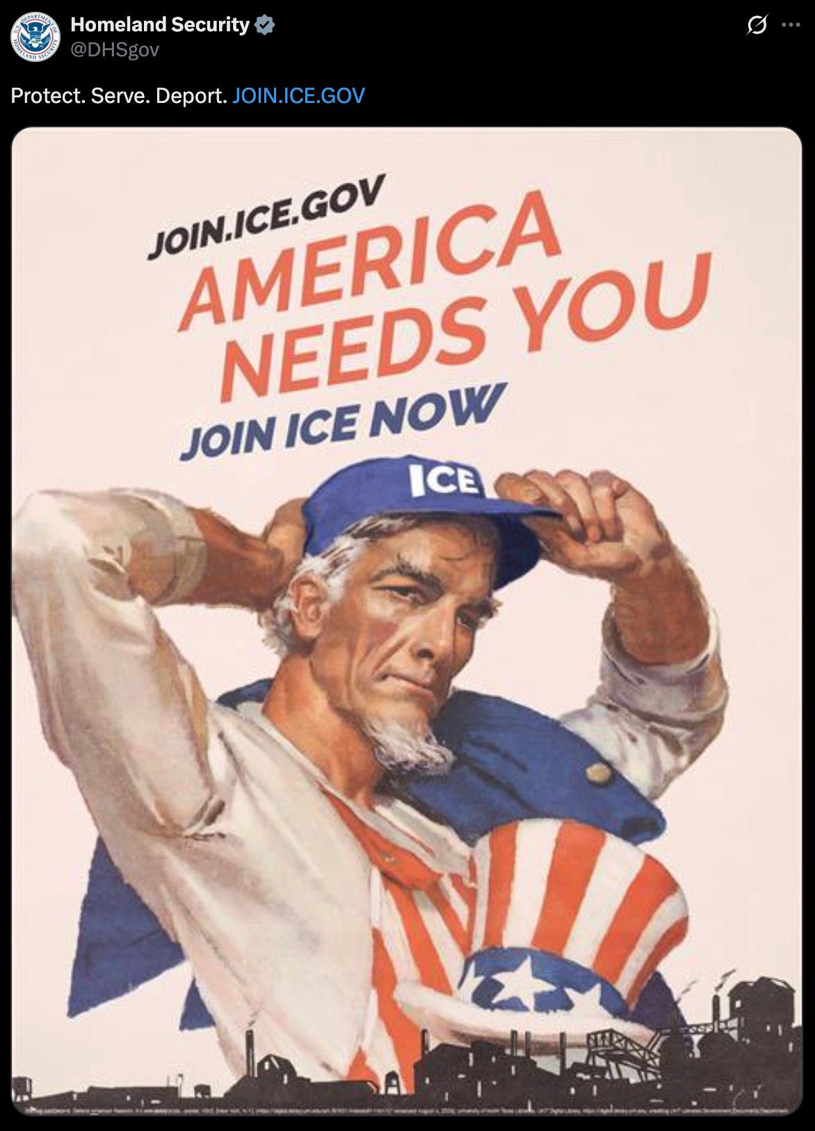 oh great. Uncle Sam has taken off his red, white and blue top hat and replaced it with an ICE cap. presumably, he’ll be putting a mask over his face next.