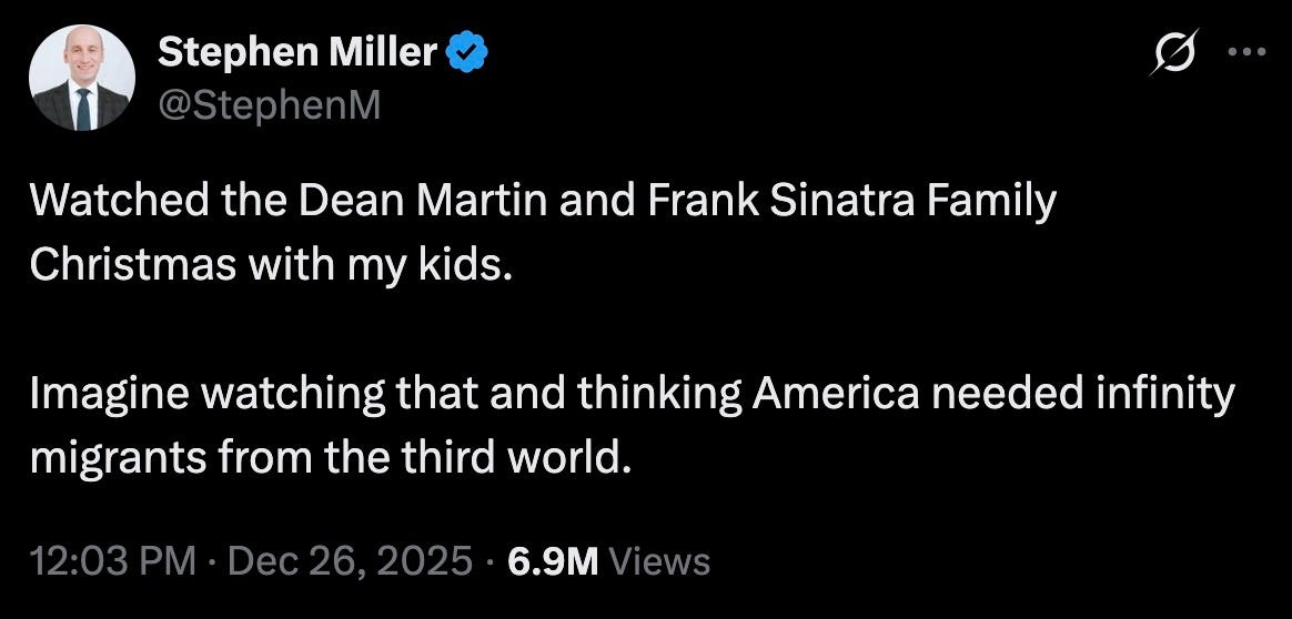 “Watched the Dean Martin and Frank Sinatra Family Christmas with my kids. Imagine watching that and thinking America needed infinity migrants from the third world.”