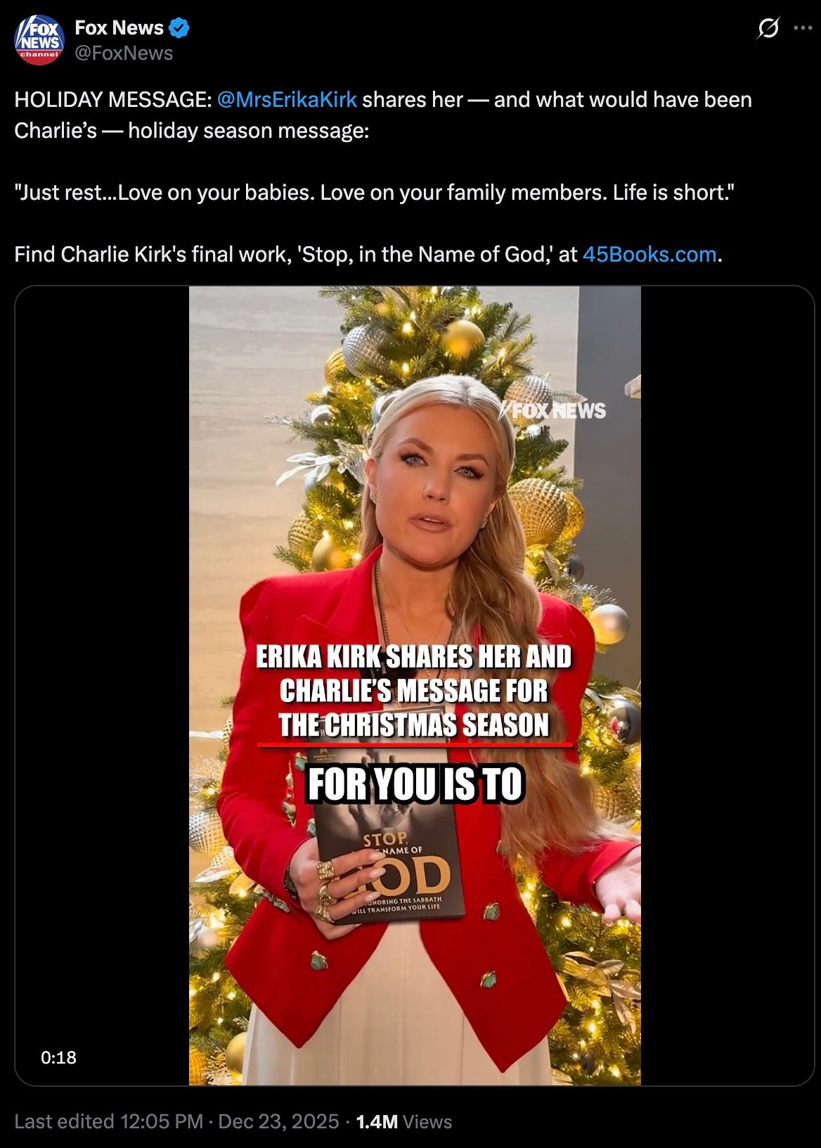 “HOLIDAY MESSAGE: @MrsErikaKirk shares her — and what would have been Charlie’s — holiday season message: ‘Just rest...Love on your babies. Love on your family members. Life is short.’ Find Charlie Kirk’s final work, ‘Stop, in the Name of God,’ at http://45Books.com.”