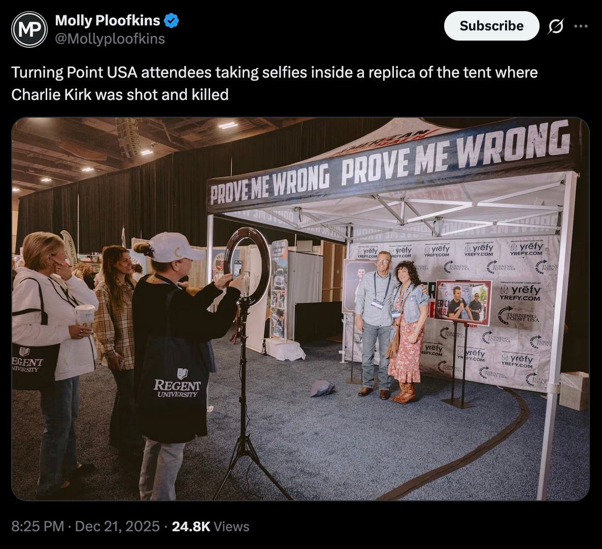 yup, they’ve recreated the tent where the misshapen gnome was assassinated — and the cultists are all invited to take selfies in it. how fucktacularly ghoulish is that?