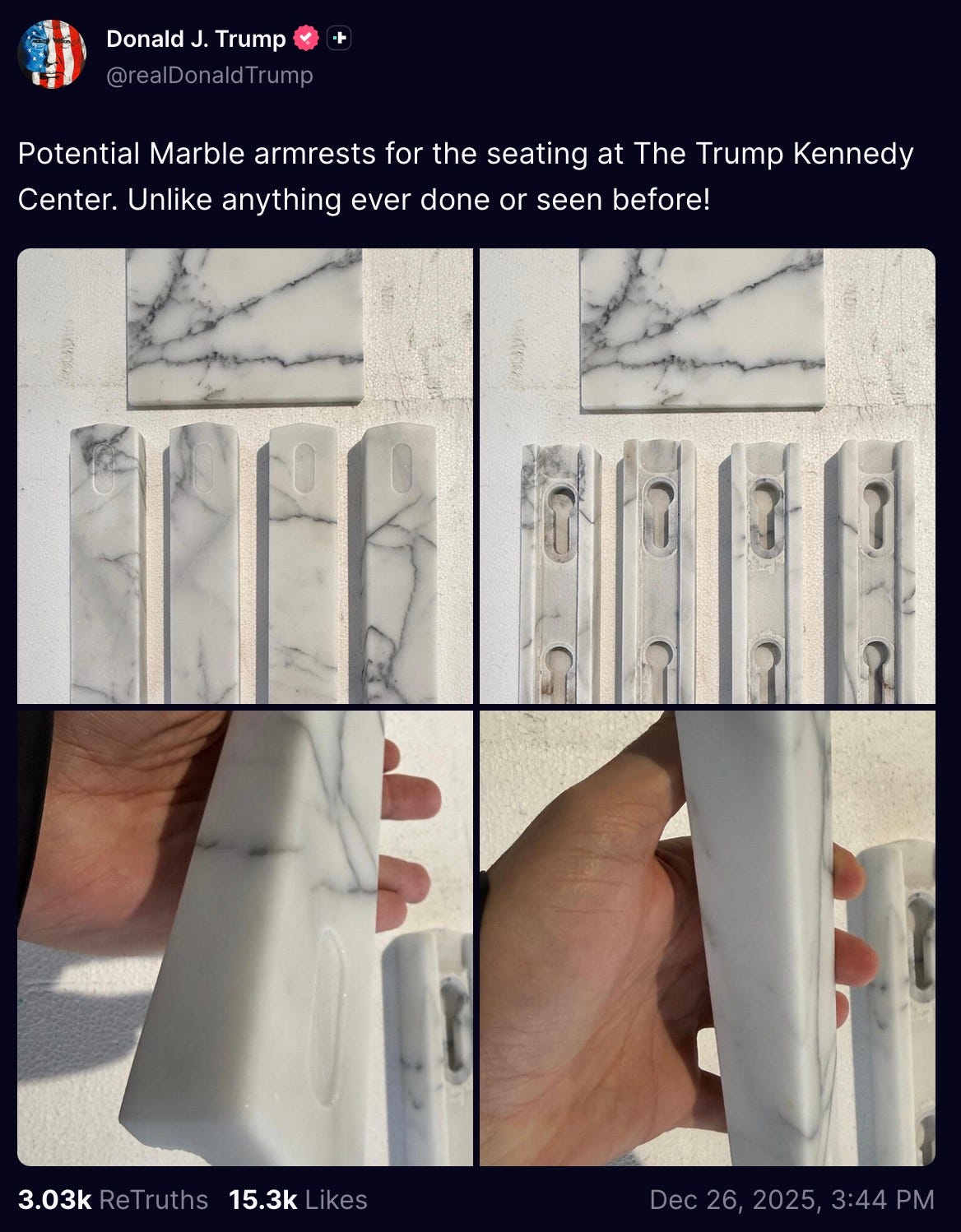 then, the fucking idiot unveiled his latest shitbrained idea: marble armrests for the seating at the Kennedy Center.