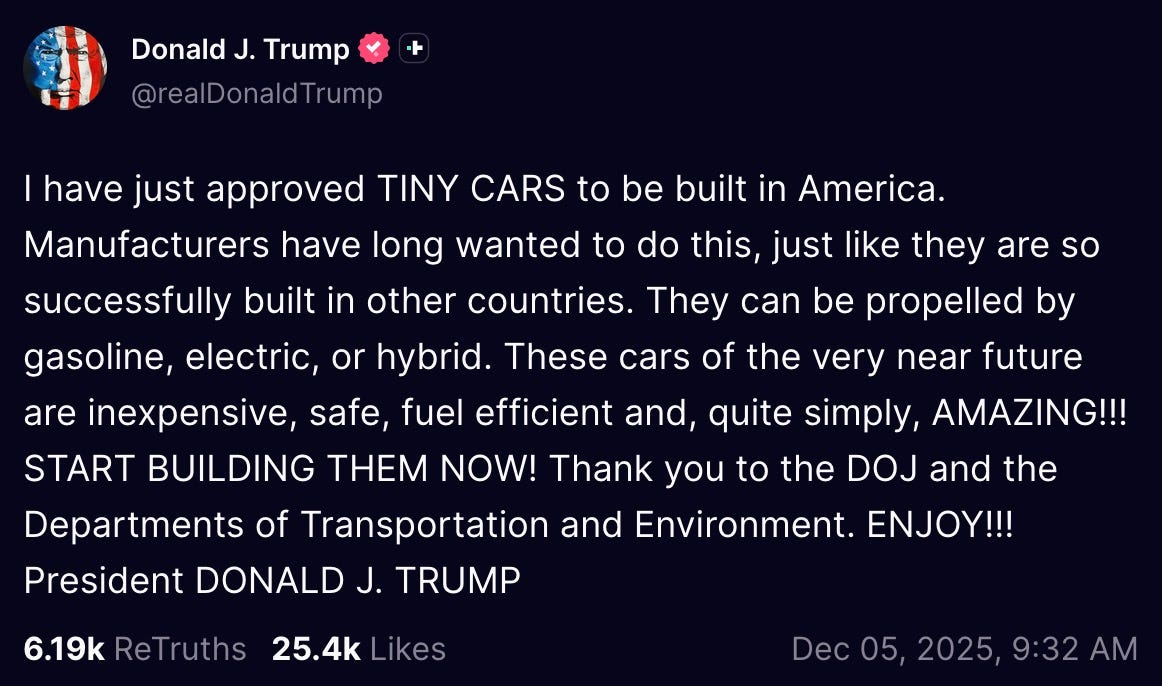 on Friday, some fucking idiot started his day by announcing that he had “just approved TINY CARS to be built in America.”