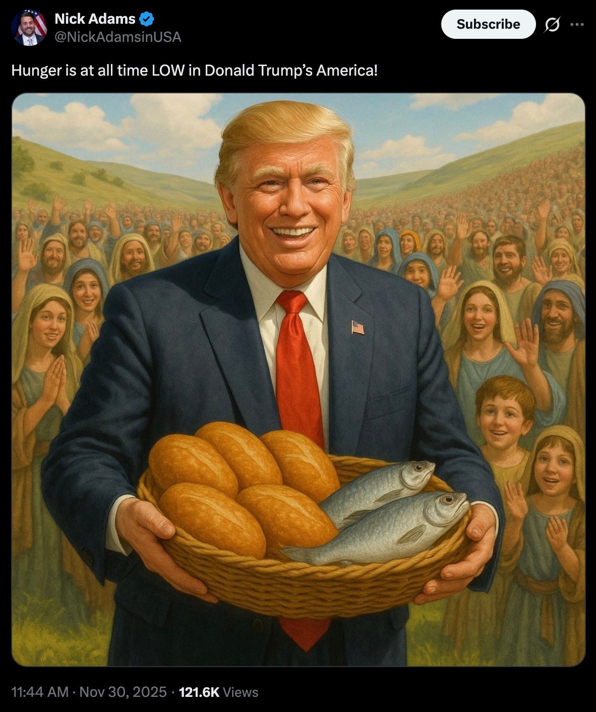 oh look, it’s the parable of the fishes and the loaves, wherein Jesus, armed with two fish and five loaves, miraculously feeds five thousand of his faithful flock. and I guess that Donny Convict is our modern-day Jesus? whatever you say, MAGA. I’m pretty sure that if Jesus returned today, he wouldn’t be some racist kiddie-fiddler.