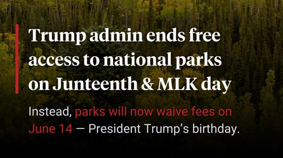 but the fucking idiot’s day wasn’t over yet. he had one more trick up his sleeve. he announced that he was ending free admission to national parks on Juneenth and Martin Luther King Day — as one does when one is a demented racist.