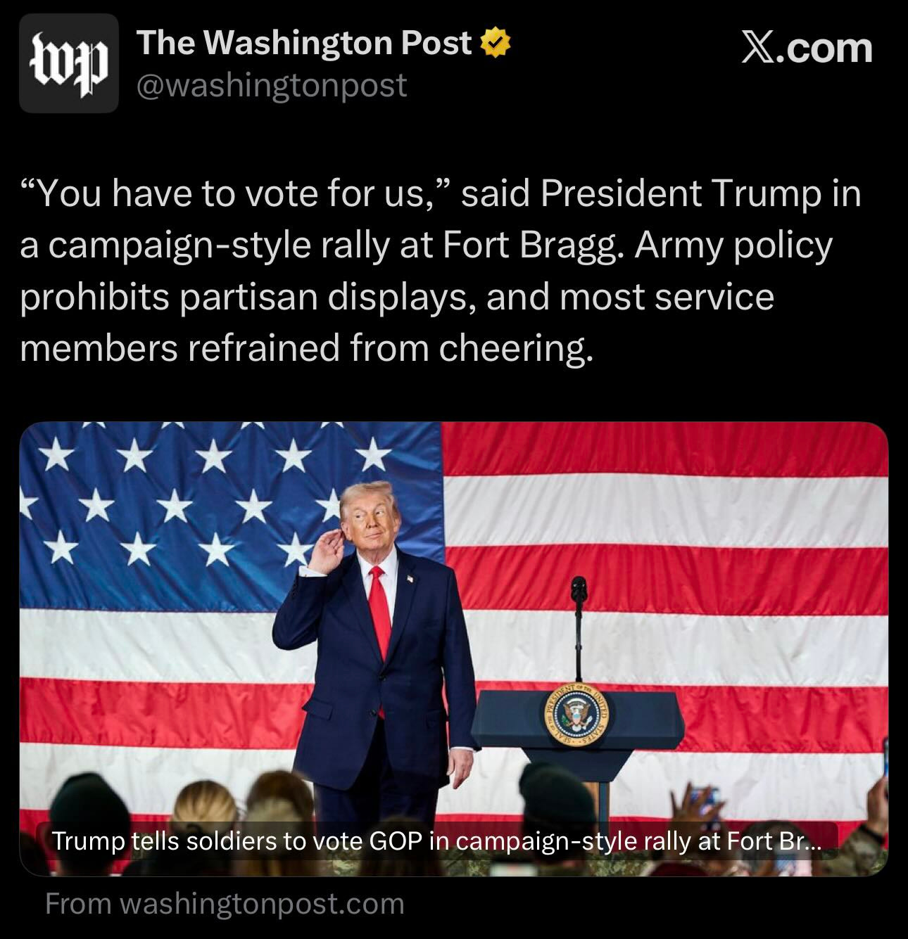the fucking idiot then held a campaign rally at Fort Bragg, where he ordered soldiers to vote for Republicans.