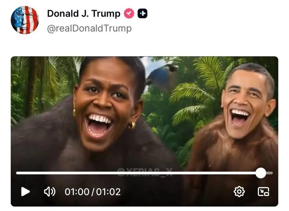 late Thursday night, some fucking idiot posted a video depicting Michelle and Barack Obama as apes. to call it deeply racist would be an understatement.