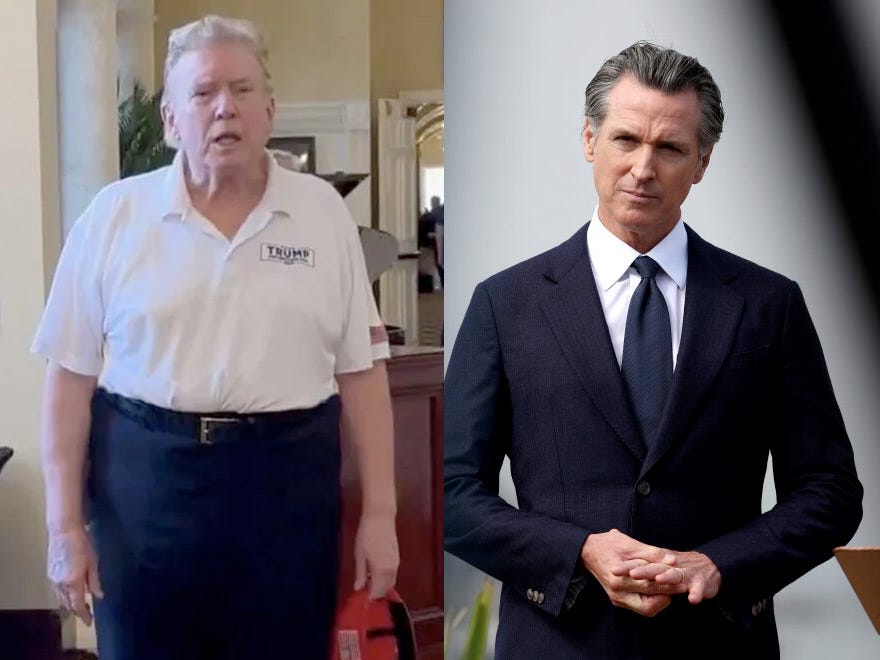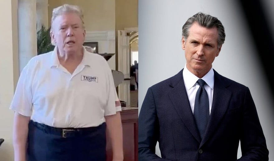 “they see Gavin Newsom as this big beefy beauty, but I would say, put up Donald Trump against him any day. and here you have Donald Trump, who’s in his very late seventies, the guy is absolutely handsome, incredible shape, he’s married to the most beautiful woman in the world, and I’d put Donald Trump up against Gavin Newsom and day of the weeks, and Gavin wouldn’t even be in the same league as Donald Trump.”