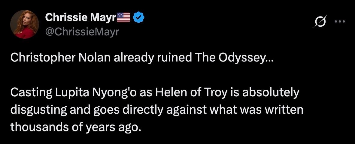 “Christopher Nolan already ruined The Odyssey… Casting Lupita Nyong’o as Helen of Troy is absolutely disgusting and goes directly against what was written thousands of years ago.”