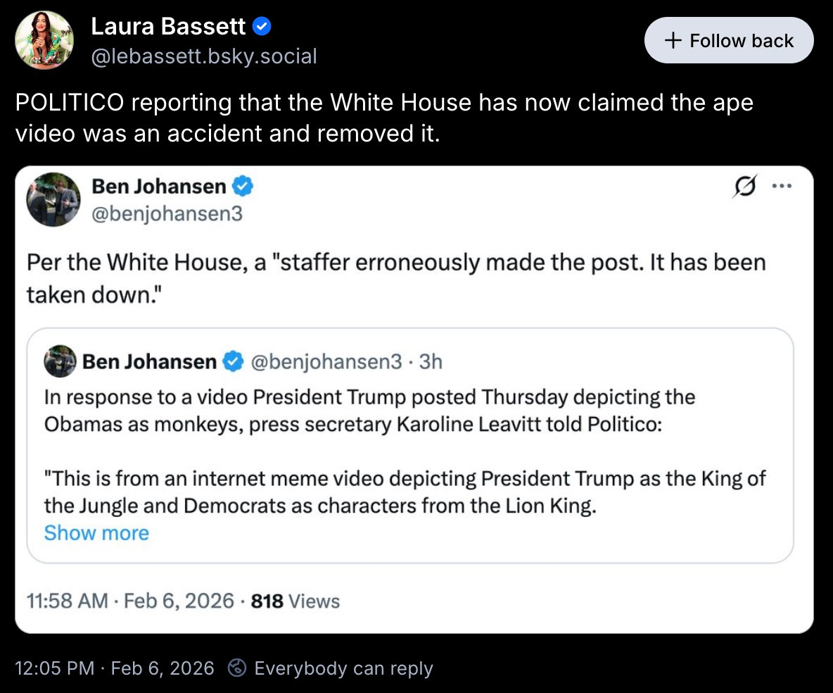 and so the White House did a remarkable thing, for them — they deleted the video, and then changed their story. it wasn’t the fucking idiot who posted the video, it was some unnamed ‘staffer’ who posted it ‘in error.’
