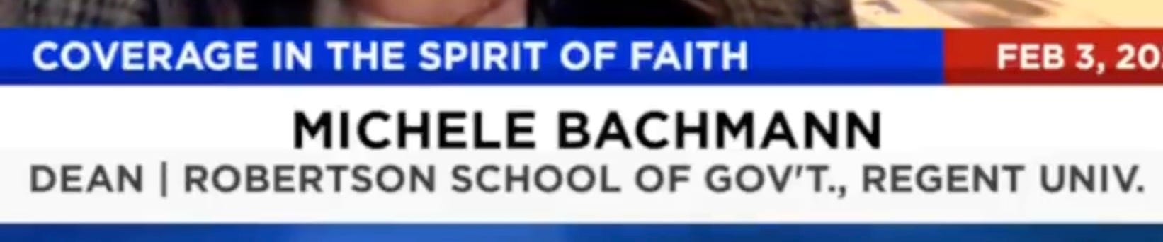 wait, the Robertson School of Government? as in Pat Robertson, the disgraced god-botherer who said 9/11 happened because feminists, and that hurricanes happen because God is mad at gays? are you telling me that he started a school, named it after himself, and now Crazypants Michele is the fucking dean? talk about failing up. or maybe sideways.