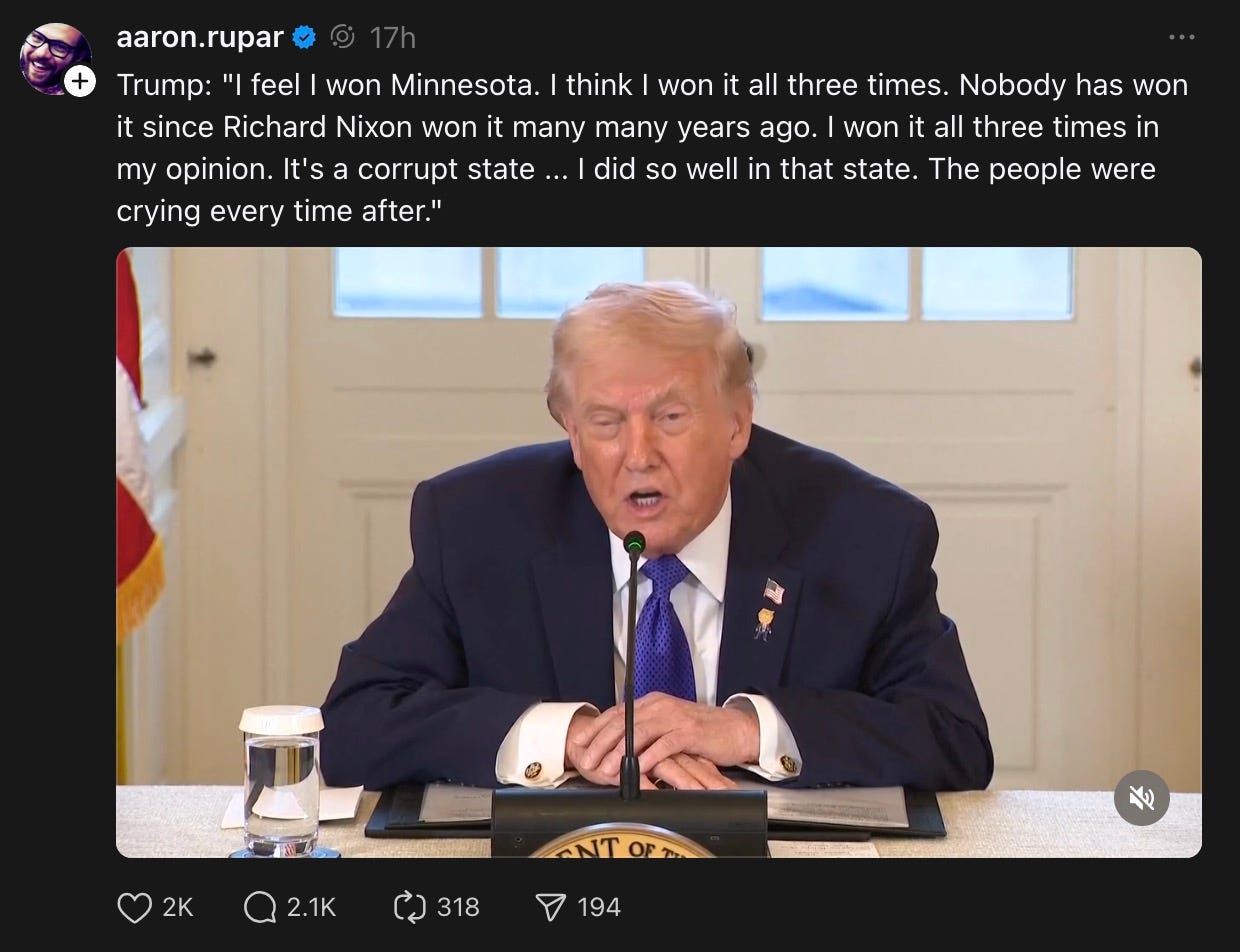 “I feel I won Minnesota. I think I won it all three times. Nobody has won it since Richard Nixon won it many many years ago. I won it all three times in my opinion. It's a corrupt state ... I did so well in that state. The people were crying every time after.”