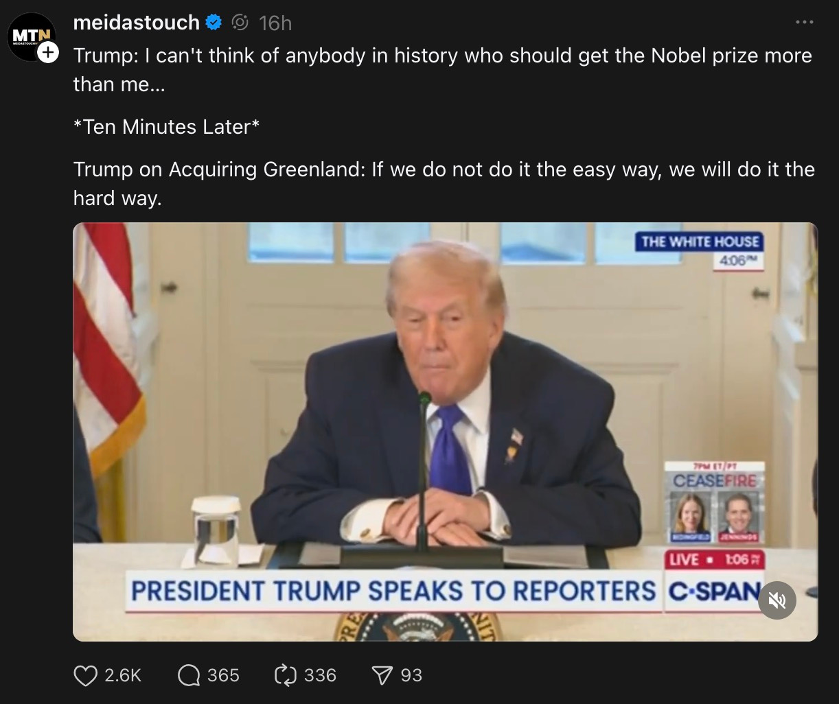 the fucking idiot also managed to both whine about not getting a Nobel Peace Prize and threaten a military invasion of Greenland, in practically the same breath.