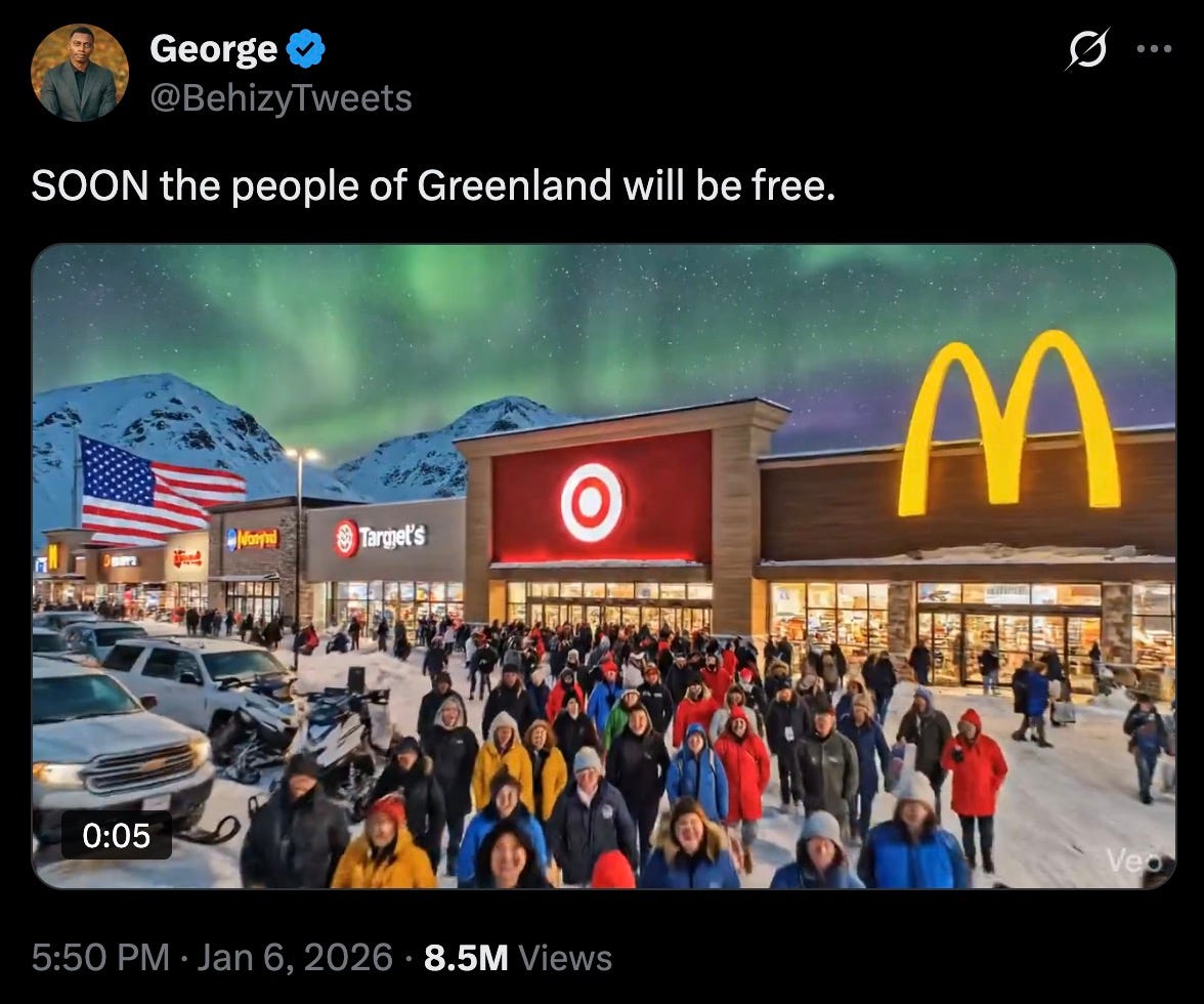 anyway, the cultists are already creating their own AI slop heralding the dawning of a New Greenland. oh my god, this rando has invented ‘strip-mall colonialism.’