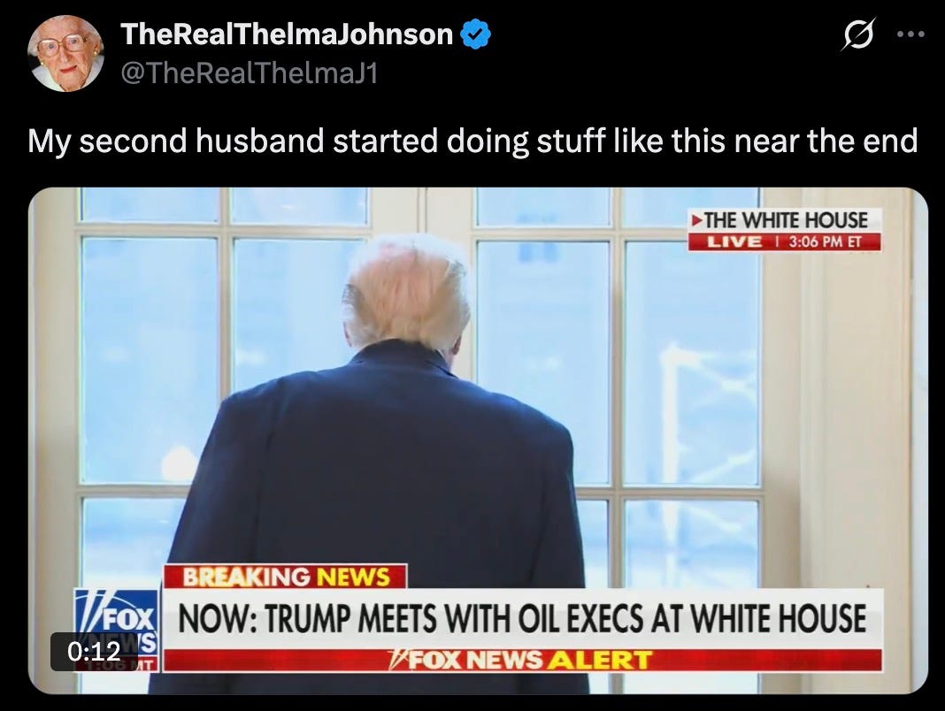 then, staring into the now-empty space where the East Wing was razed to make room for his beloved Epstein Dance Hall, the fucking idiot excitedly burbled ‘wow. what a view! this is the door to the ballroom!’ — as one does, when one is a fucking idiot whose demented brain has completely ossified.