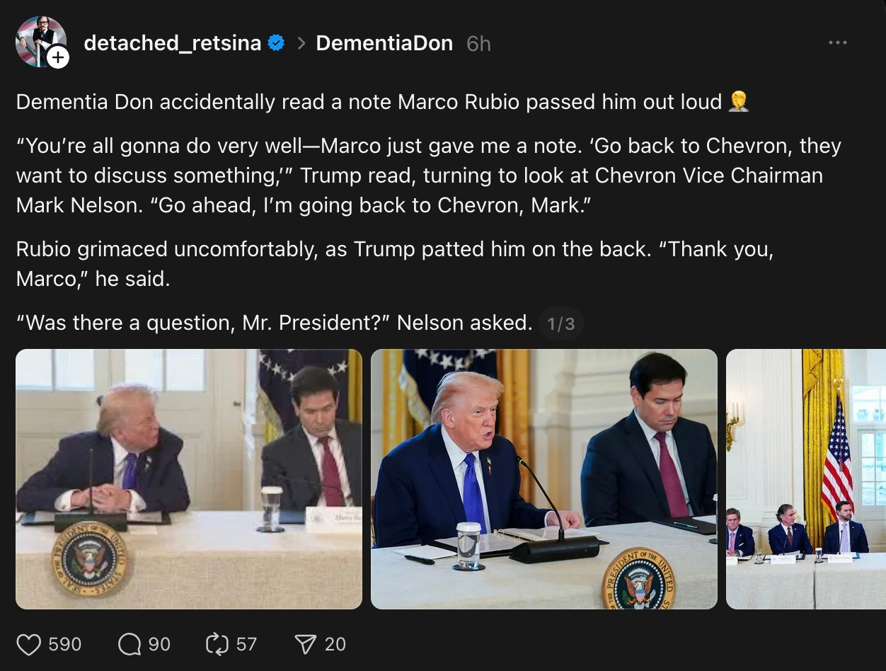 “You’re all gonna do very well—Marco just gave me a note. ‘Go back to Chevron, they want to discuss something,’” Trump read, turning to look at Chevron Vice Chairman Mark Nelson. “Go ahead, I’m going back to Chevron, Mark.”Rubio grimaced uncomfortably, as Trump patted him on the back. “Thank you, Marco,” he said.