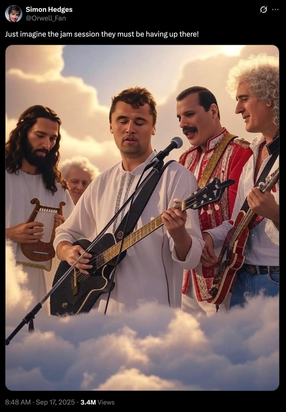so, for those of you keeping score at home, Kirk was both an annoying debate-me bro and a time-traveling avatar for his minders — and, now that he’s left this earthly plain, he’s a heavenly horse farmer and lead guitarist for the ethereal rock band Jesus and His 13 Apostles.