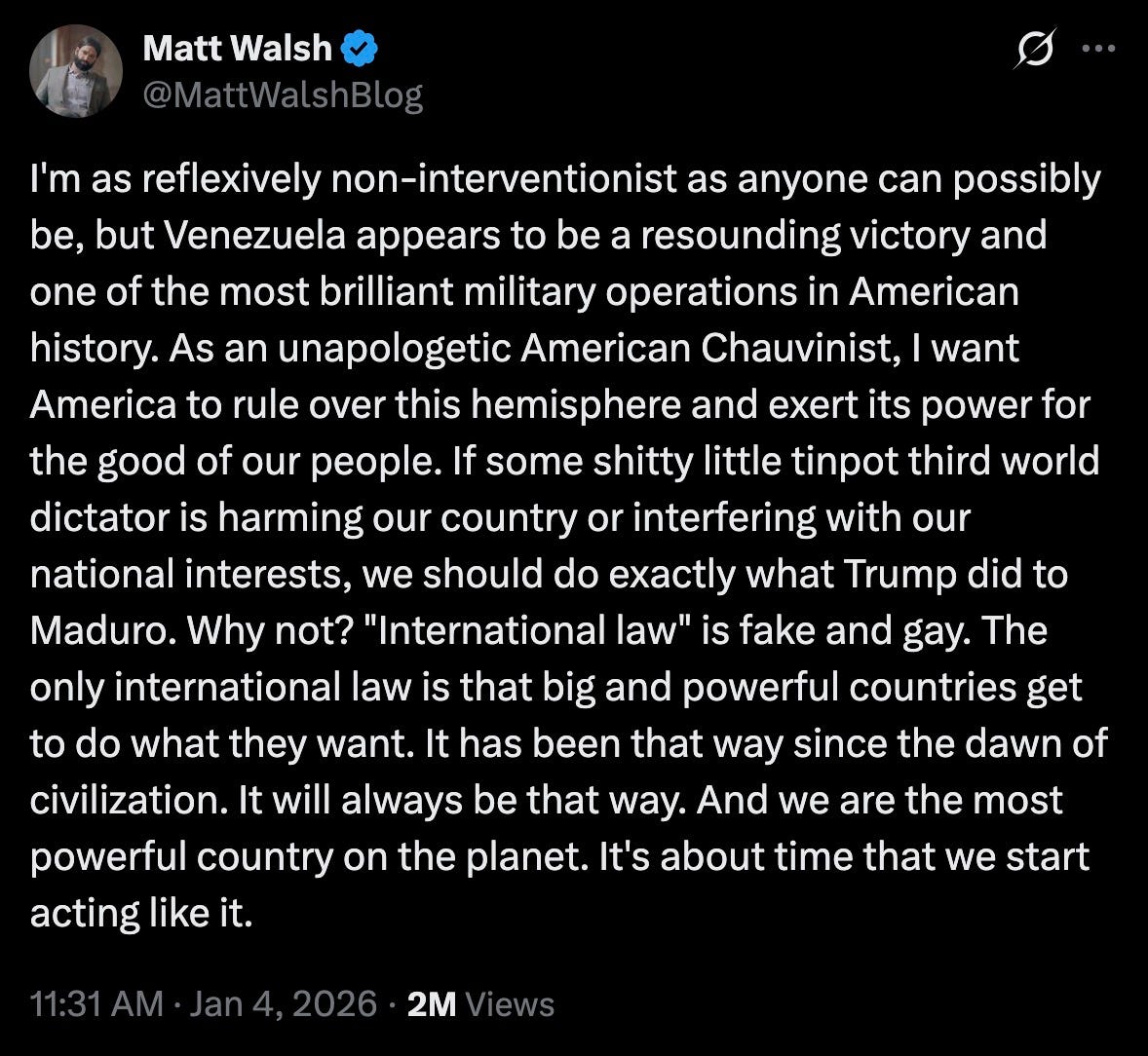 “If some shitty little tinpot third world dictator is harming our country or interfering with our national interests, we should do exactly what Trump did to Maduro. Why not? ‘International law’ is fake and gay.”