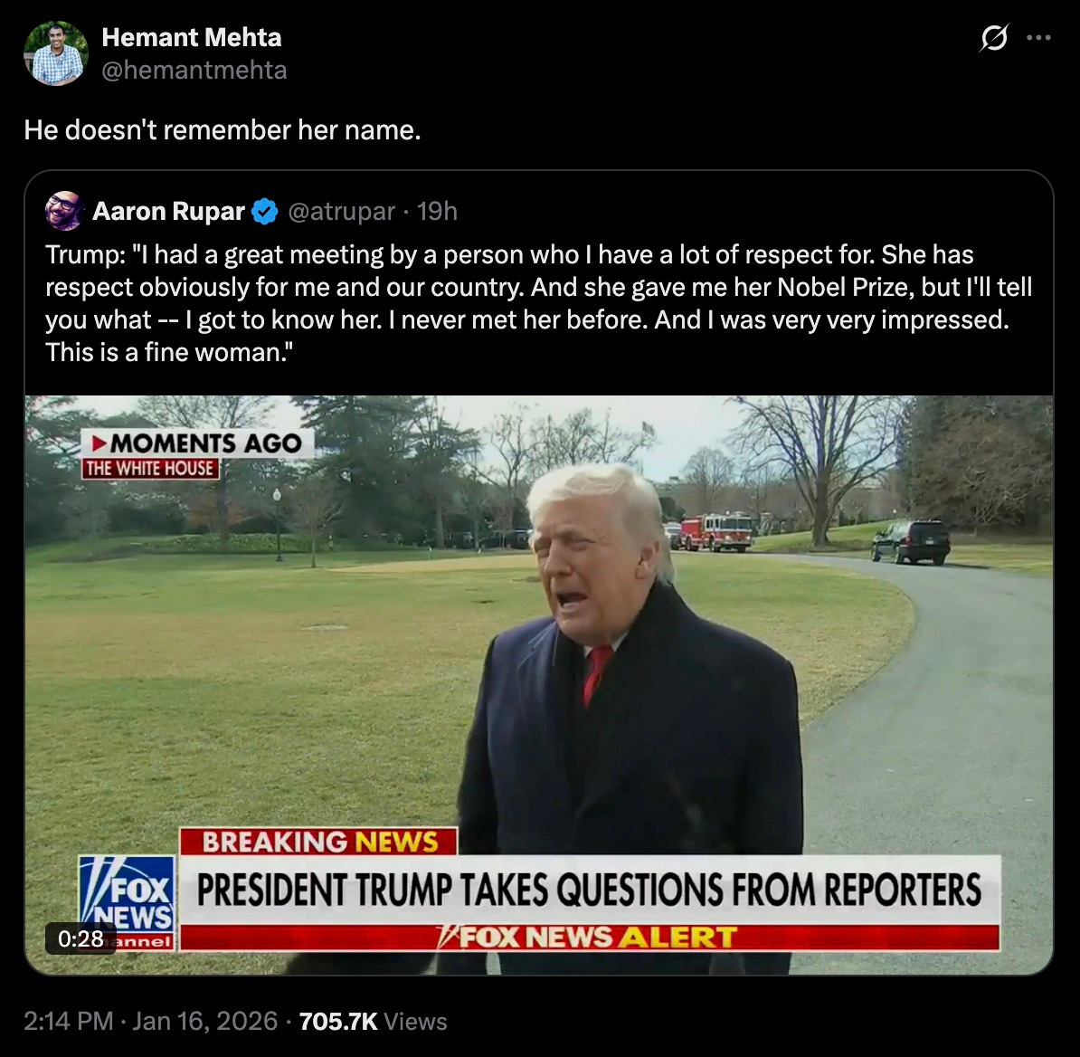 oh, and get this: the fucking idiot was too demented to remember the name of the woman who’d given him her Nobel Peace Prize only the day before.