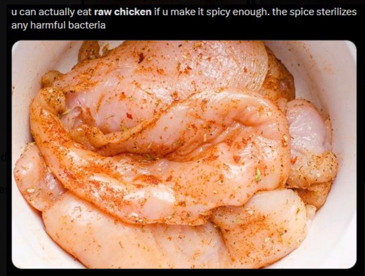 “u can actually eat raw chicken if u make it spicy enough. the spice sterilizes any harmful bacteria”