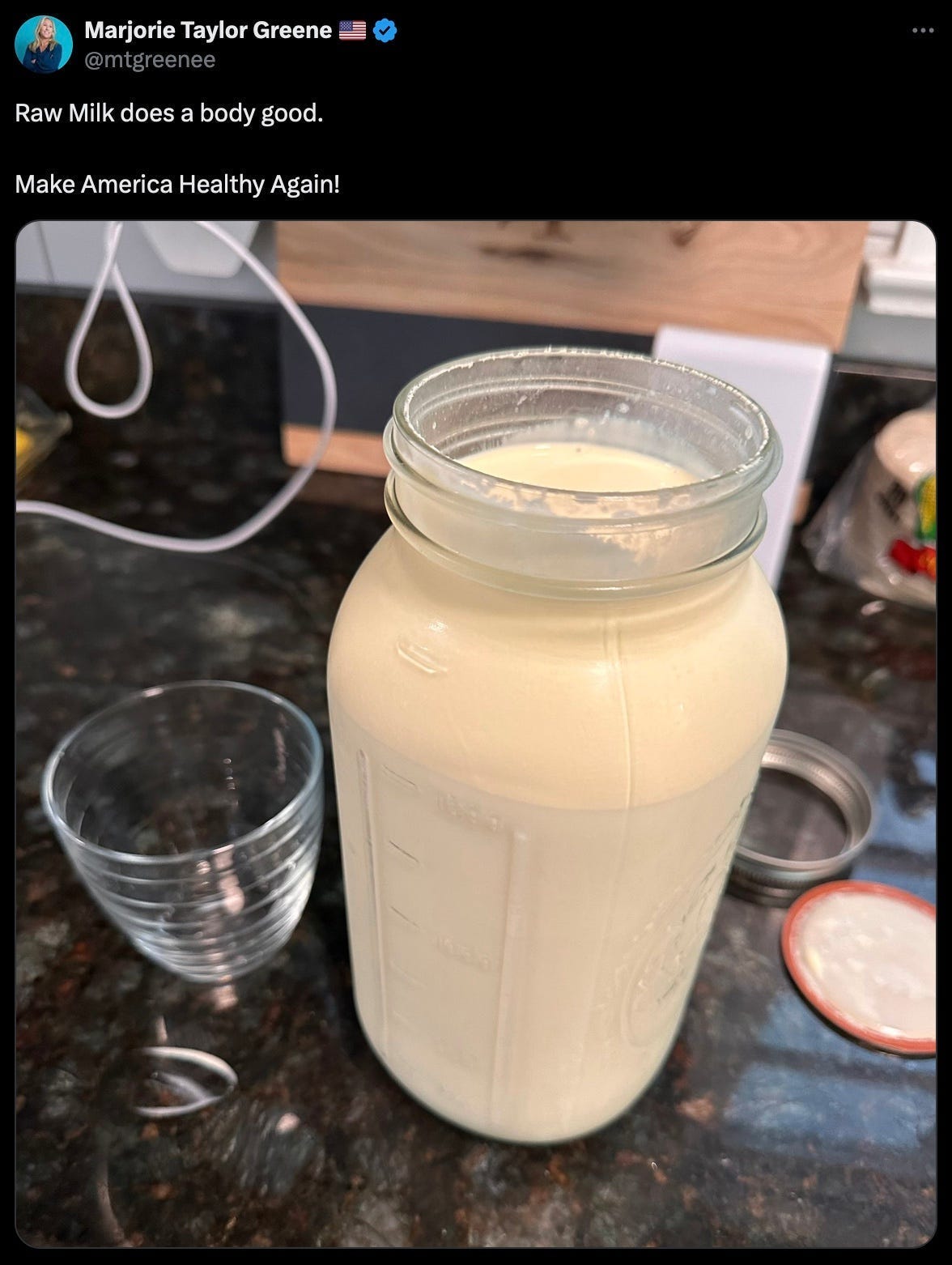 hey, remember the ‘raw milk’ craze of 2024? loyal MAGA cultists coast to coast were super into guzzling moo-juice straight from the source — because fuck pasteurization. that weak-ass shit’s for radical leftist lunatics.