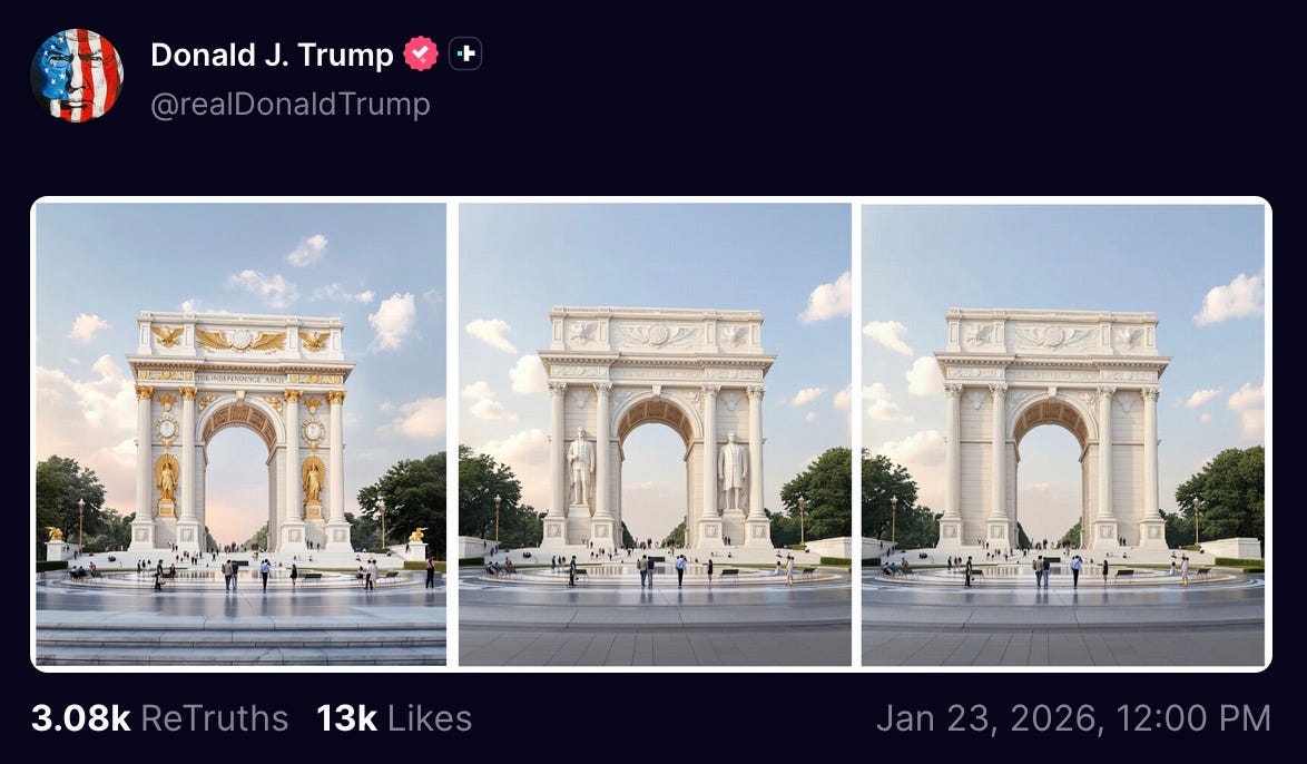 oh look, it’s a rendition of one of his stupid triumphal arches, compete with the same fake-gold crap he’s used to cheapen the Oval Bordello.