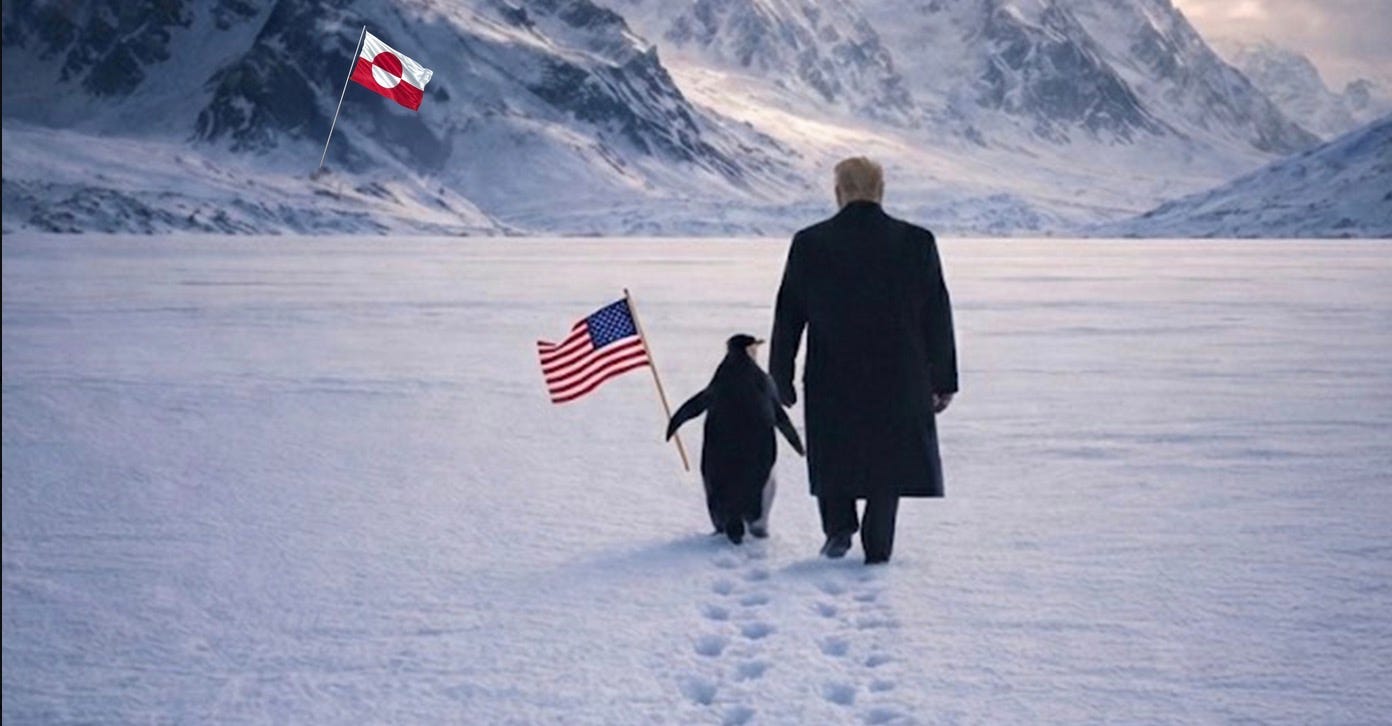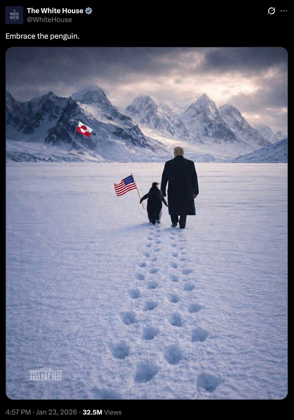 finally, the White House shat this fever-swamp nonsense onto Elon’s Nazi Bar and Child Porn Emporium: the fucking idiot and a penguin, strolling arm and arm like the best buds they are, in the general direction of Greenland.