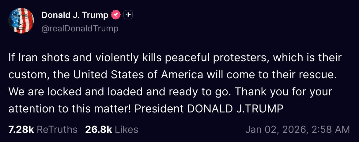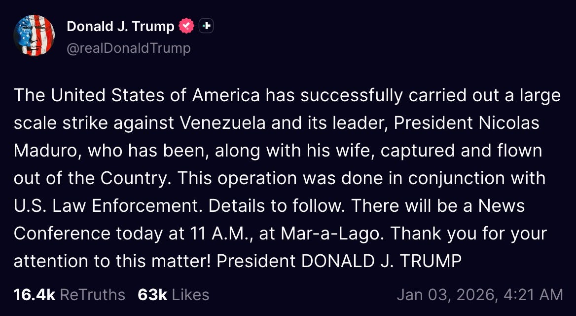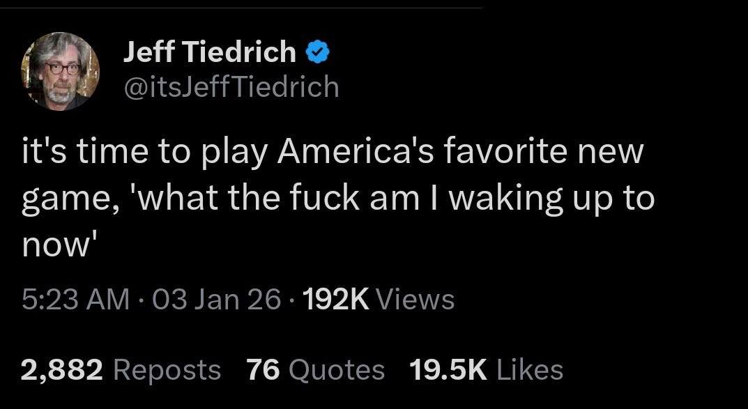 at four o’clock in the morning — twenty five hours after threatening Iran — the fucking idiot announced that he had bombed Venezuela, kidnapped President Maduro and his wife, and flown them out of the country, to stand trial here in America.
