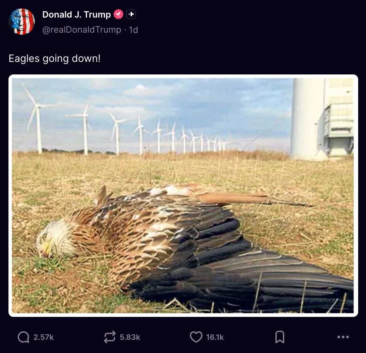 the fucking idiot then posted a photo that allegedly shows a bald eagle that had supposedly been windmilled to death. how could we let something like this happen in America? to our national bird, no less!