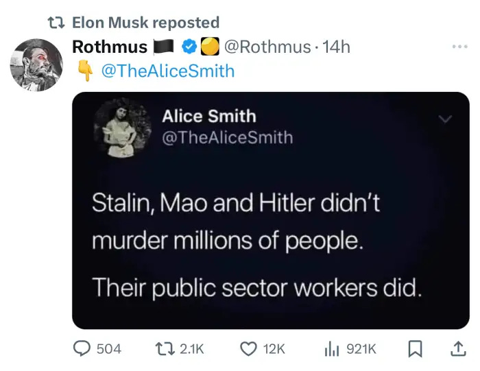 “Stalin, Mao and Hitler didn’t murder millions of people. their public sector workers did.”