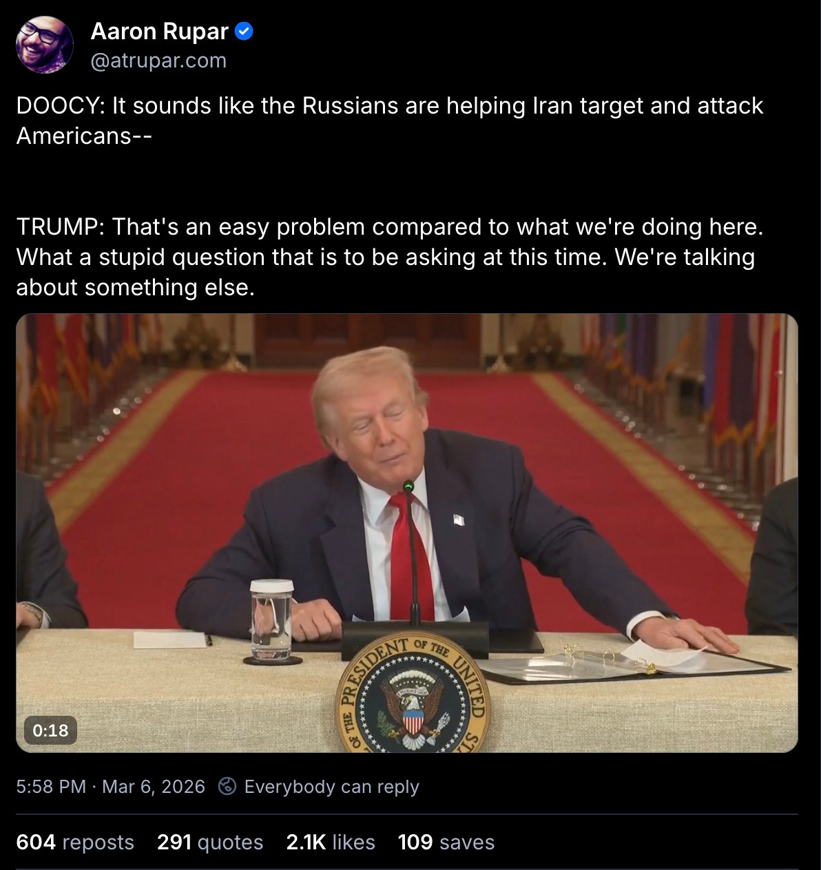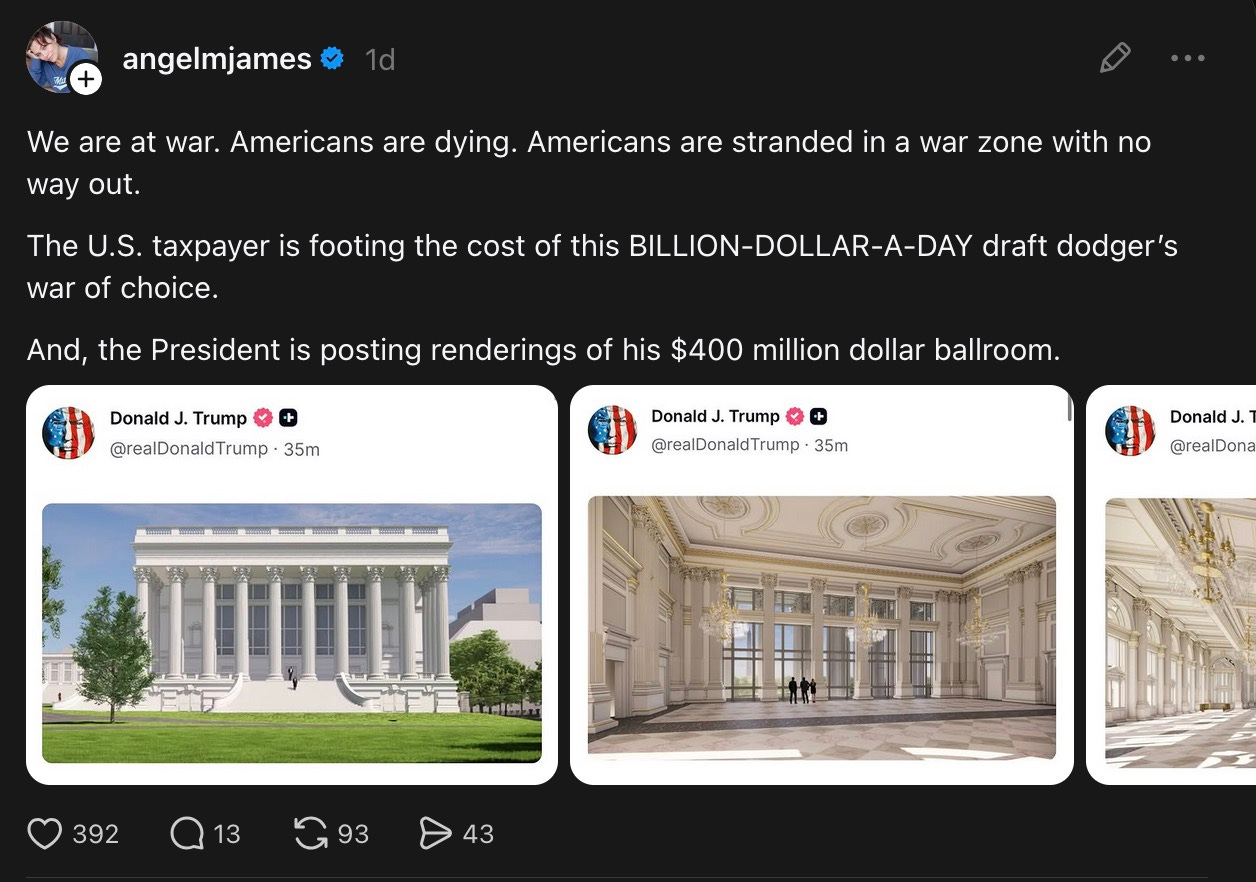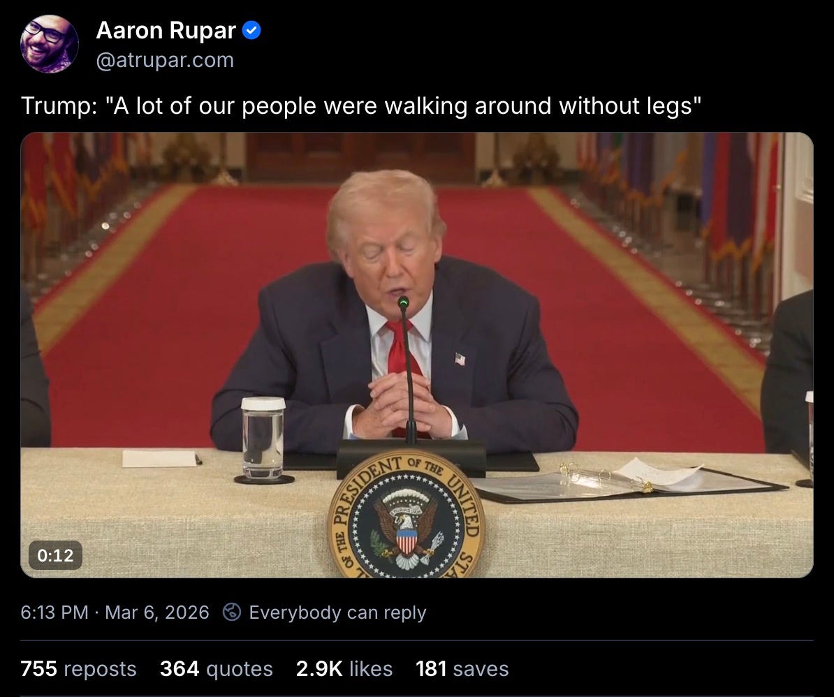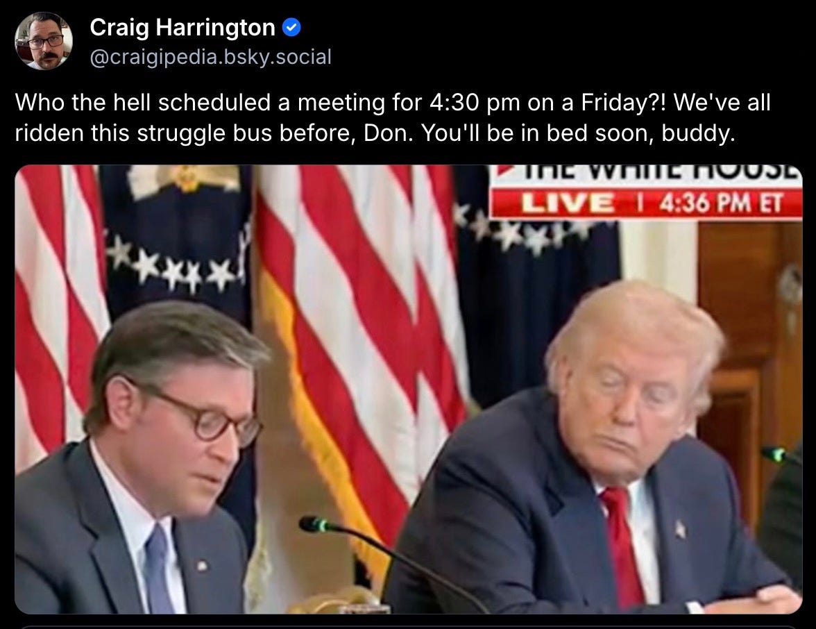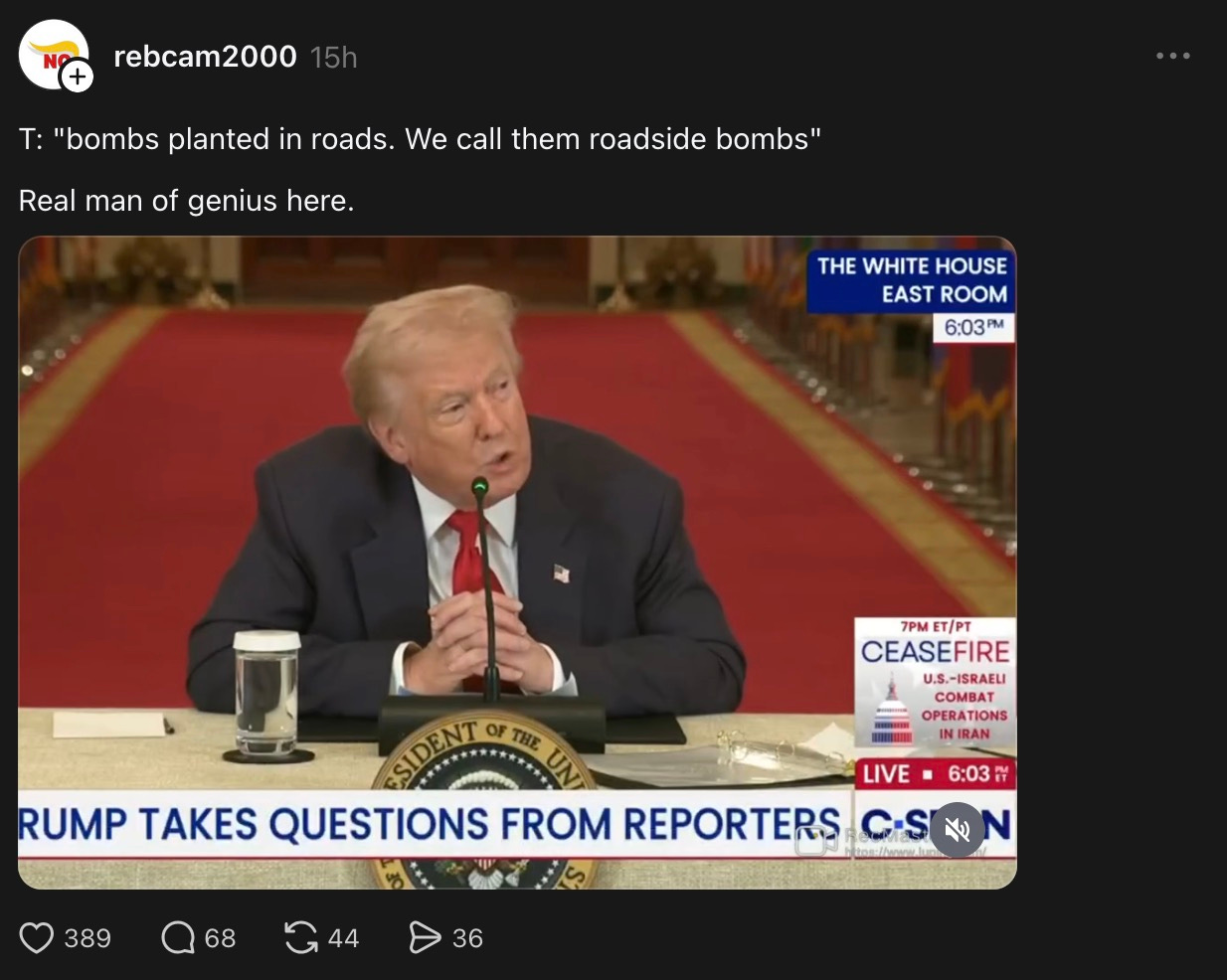 some fucking idiot began his Friday by demanding the UNCONDITIONAL SURRENDER of Iran. Congressional Republicans have been assuring us repeatedly that we are not at war with Iran, so I’m not sure what Iran is supposed to be UNCONDITIONALLY SURRENDERING from. but, like, whatever.