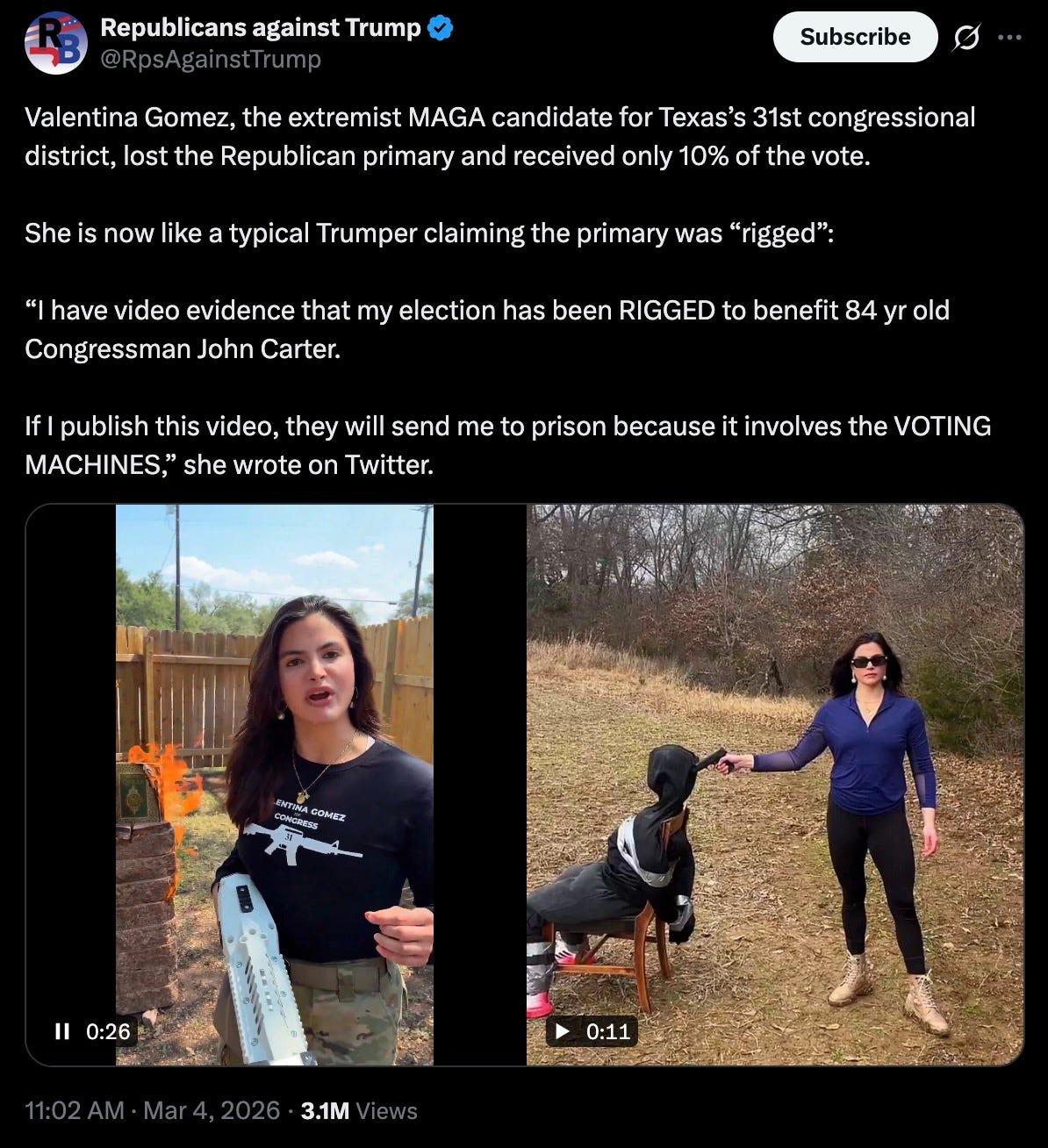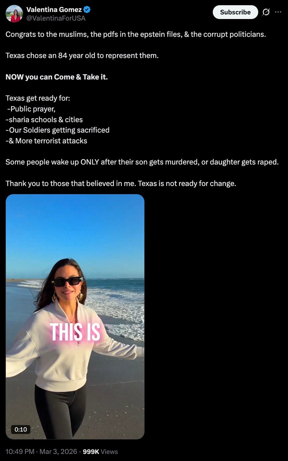 Texas held their primaries on Tuesday, and professional election-loser Valentina Gomez was right there in TX’s 34th District to do what she does best: lose bigly to the Republican incumbent she was running against, and then show up at Elon’s Nazi Bar and Child Porn Emporium to bitch and moan about it.