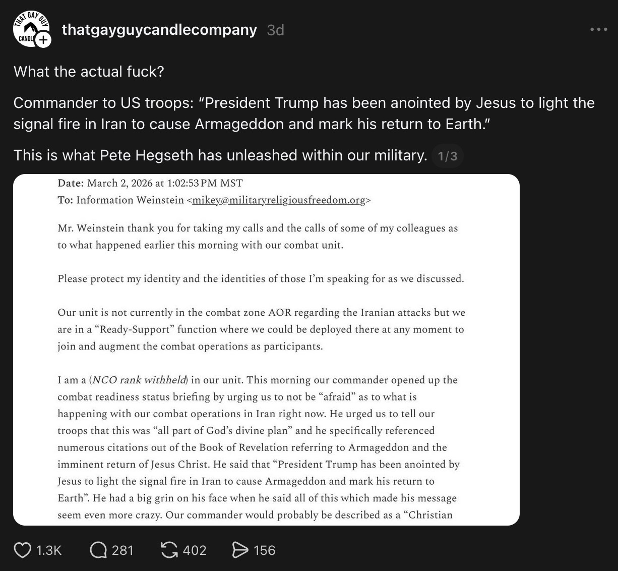 is it when your country’s military commanders say terrifying shit like ‘President Trump has been anointed by Jesus to light the signal fire in Iran to cause Armageddon and mark his return to Earth’?
