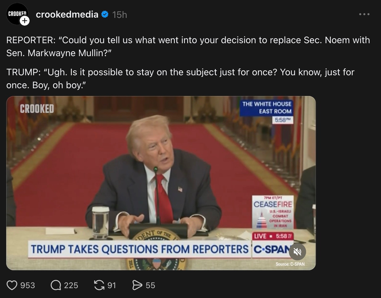 the fucking idiot then got Big Mad at another reporter who had the temerity to ask about ICE Barbie and Marky Many Names.
