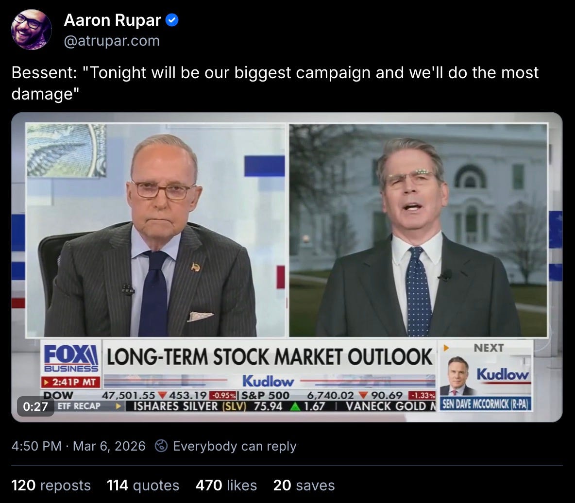 now, I realize that this next bit is fucking-idiot-adjacent, but why is the Secretary of the Treasury privy to war plans, and why is he blabbing about them on Fox News?