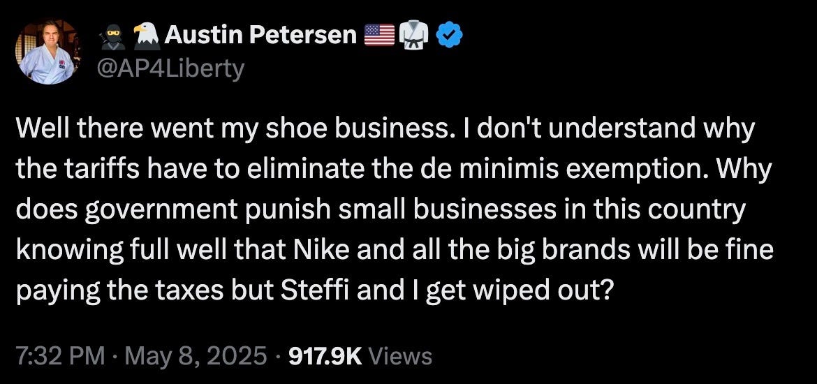 “Well there went my shoe business. I don’t understand why the tariffs have to eliminate the de minimis exemption. Why does government punish small businesses in this country knowing full well that Nike and all the big brands will be fine paying the taxes but Steffi and I get wiped out?”